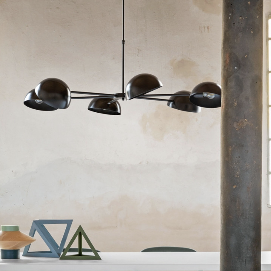 Die Metalldiffusoren haben die Form halbkugelförmiger Kappen, die nach individuellen Bedürfnissen oder Vorlieben eingestellt werden können, um direktes oder indirektes Licht zu haben.