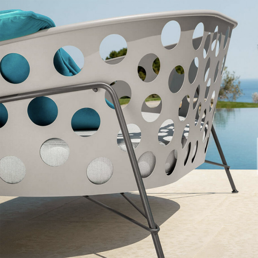 Die neue Bolle-Kollektion wurde für den Außenbereich geschaffen und umfasst Sofas, Sessel und Lampen aus makroperforiertem farbigem Metall mit einer weichen und spielerisch faszinierenden Ästhetik. Der Name Bolle leitet sich von der besonderen Verarbeitung der Metallschalen ab, die ein Muster mit starker grafischer Wirkung erzeugt.