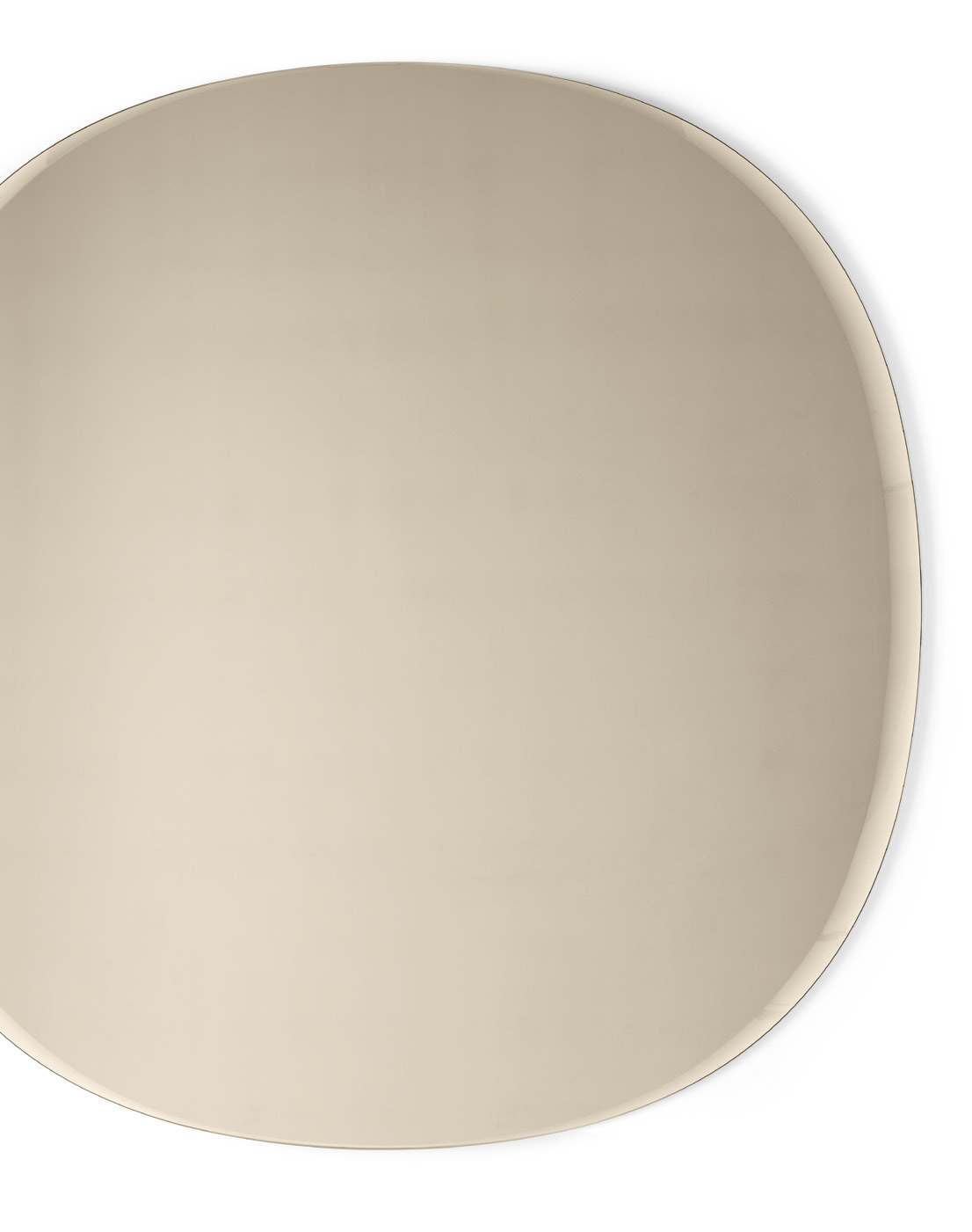 Brame Spiegel von Calligaris. Der Brame Spiegel zeichnet sich durch weiche, abgerundete Formen aus, die von der Silhouette eines Steins inspiriert sind und durch eine doppelte Abschrägung verstärkt werden, die die Form weiter definiert und Dynamik erzeugt. Erhältlich in Rauch- und Bronzeausführung, passt der Spiegel problemlos in jeden Raum.