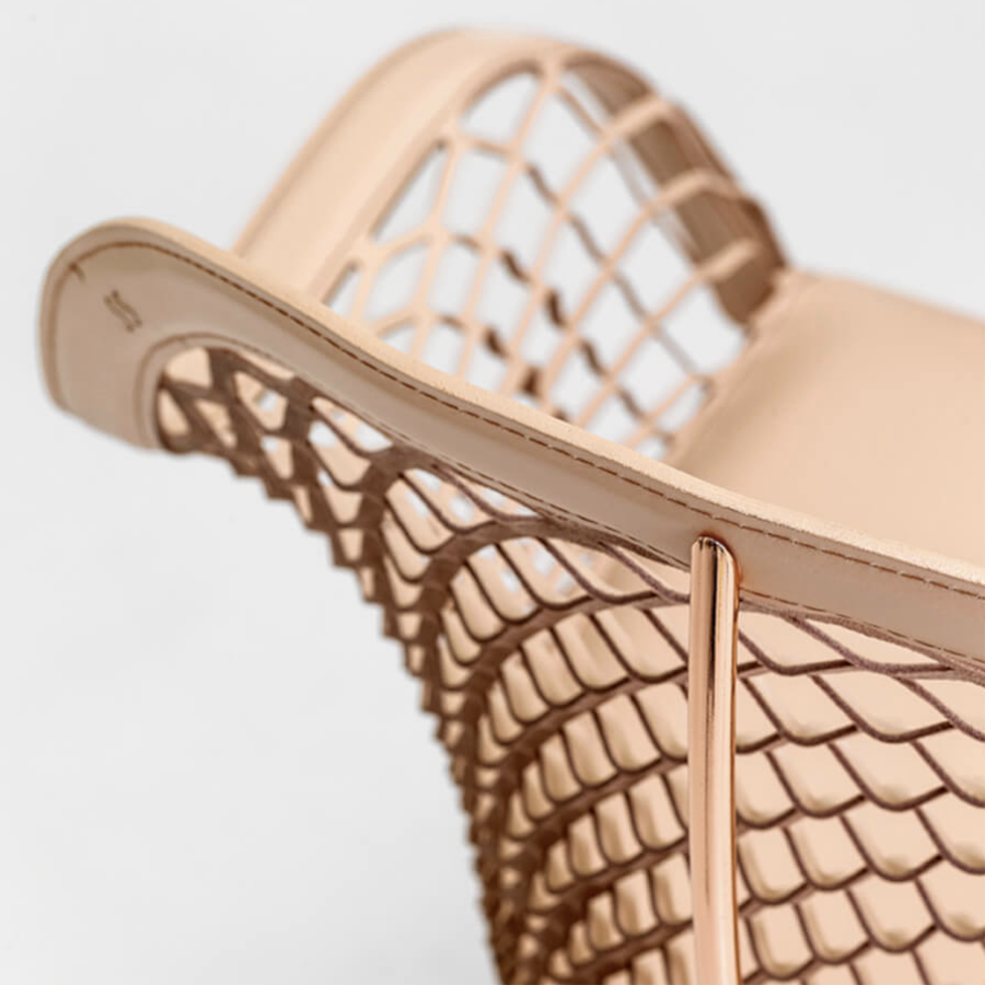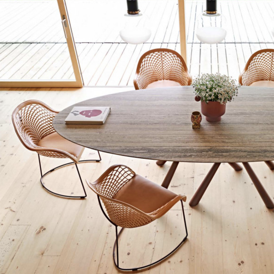 Sessel mit Kufengestell erhältlich in lackiertem, verchromtem, roségoldenem oder schwarzem Nickelstahl. Sitz und Rückenlehne aus Leder oder toskanischem Leder.