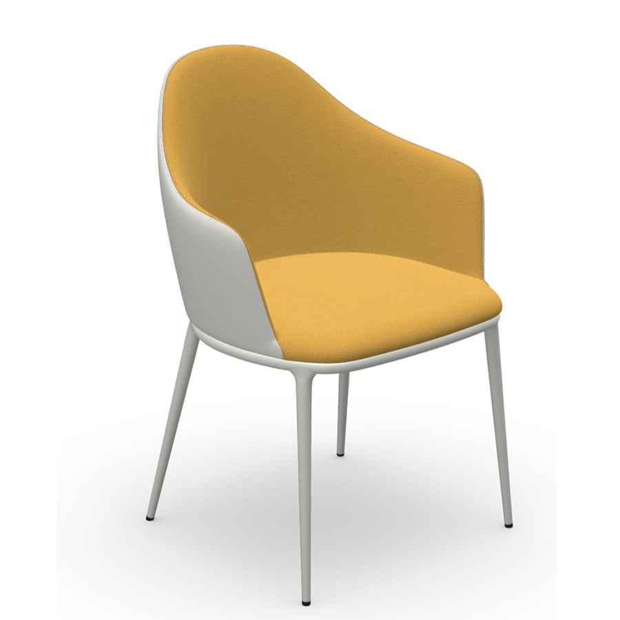 Sessel Lea mit vierbeinigem Metallgestell. Sitz und Rücken gepolstert in Stoff, Leder oder Kunstleder, auch mit unterschiedlichen Stoffen. Optional: Rückenlehne aus Holz.