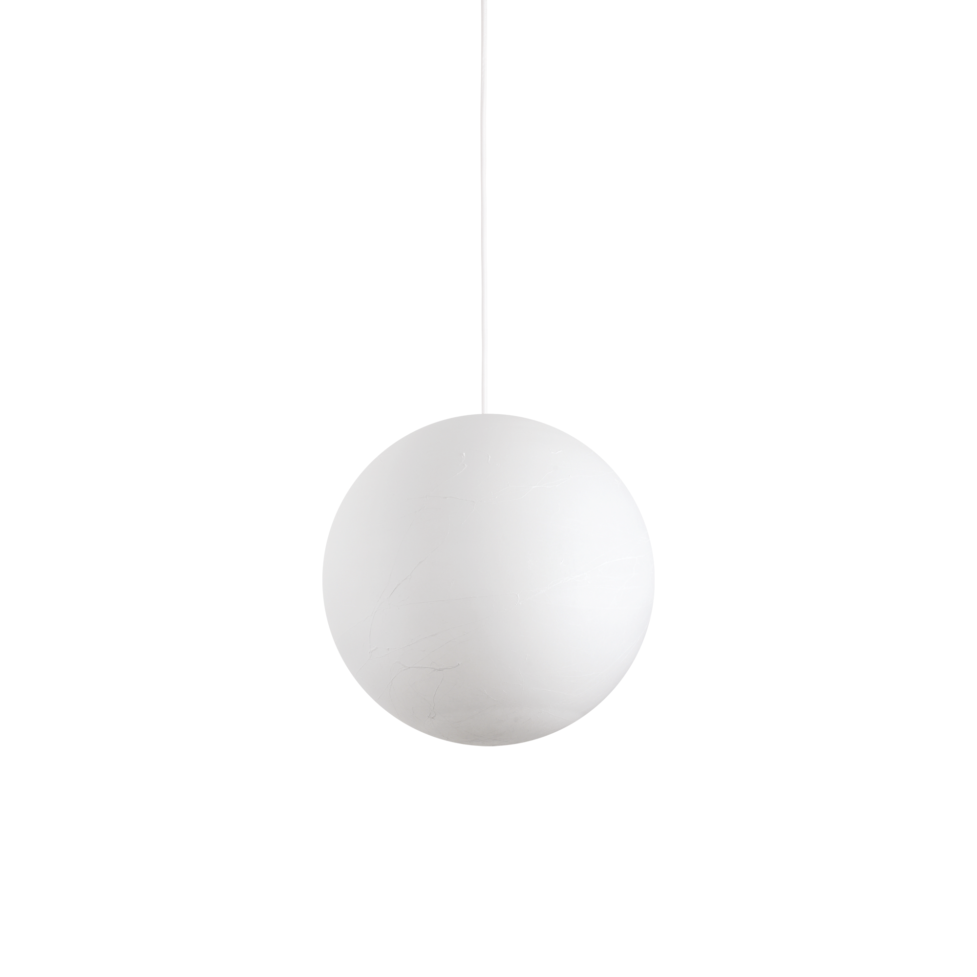 Carta-Hängeleuchter mit mattweiß lackiertem Metallrahmen. Diffusor aus Polycarbonat mit Beschichtung in Papieroptik. Stoffummanteltes Kabel. Glühbirne ausgeschlossen.