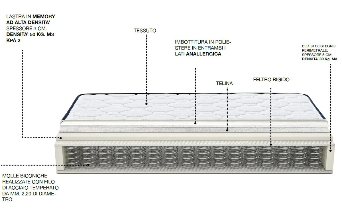 Matratze aus bikonischen Federn (Bonnelsystem), gehärtet mit hoher Tragfähigkeit, aus Kohlenstoffstahldraht und verbunden durch Stahldrahtspiralen. Das umlaufende Stützkastensystem aus unverformbarem Schaumstoff und eine Memory-Platte vervollständigen diese Matratze mit traditionellen Federn und hypoallergener Polsterung. Einzelmatratze 200 Federn, Doppelmatratze 400 Federn.