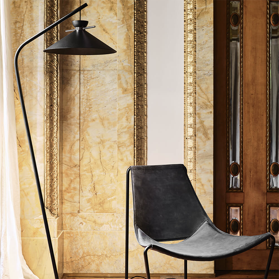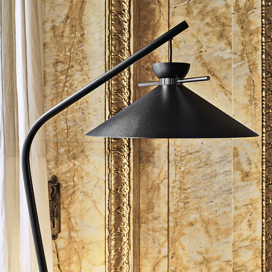 Zeitgenössische Oberflächen und lineare Formen sind Ausdruck eines Konzepts, das mit der Kultur der aufgehenden Sonne verbunden ist: das Überflüssige zu beseitigen und das Wesentliche ans Licht zu bringen. Die orientalische Bildsprache wird auch in einer didaktischeren Tonart dargestellt. Der schwarze oder weiße Lampenschirm aus Stahl erinnert an die konische Form des typischen Strohhuts der orientalischen Reisbauern, während der verchromte Stab an die Essstäbchen erinnert, mit denen Frauen ihre Haare zusammenbinden.
