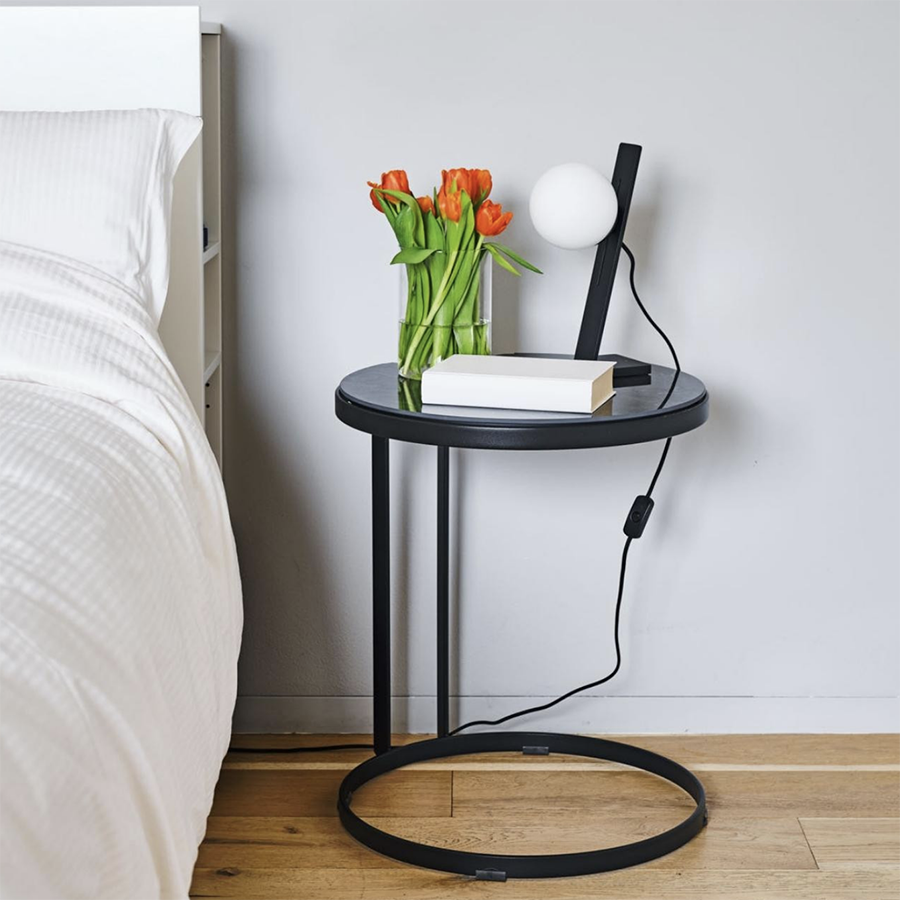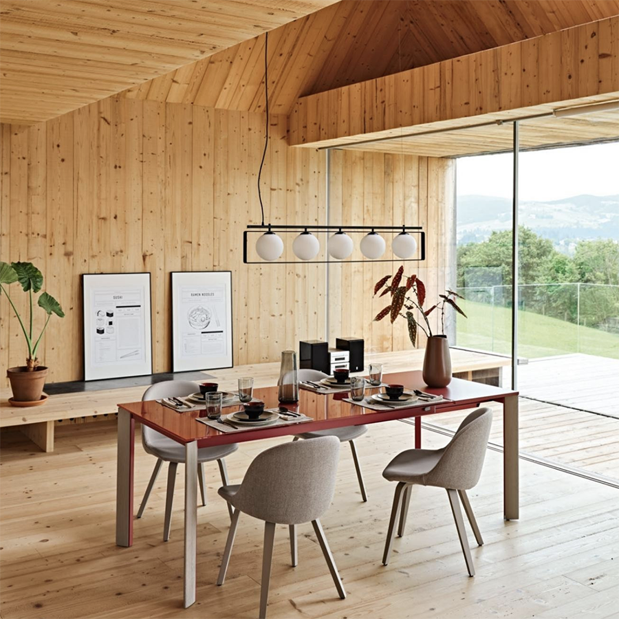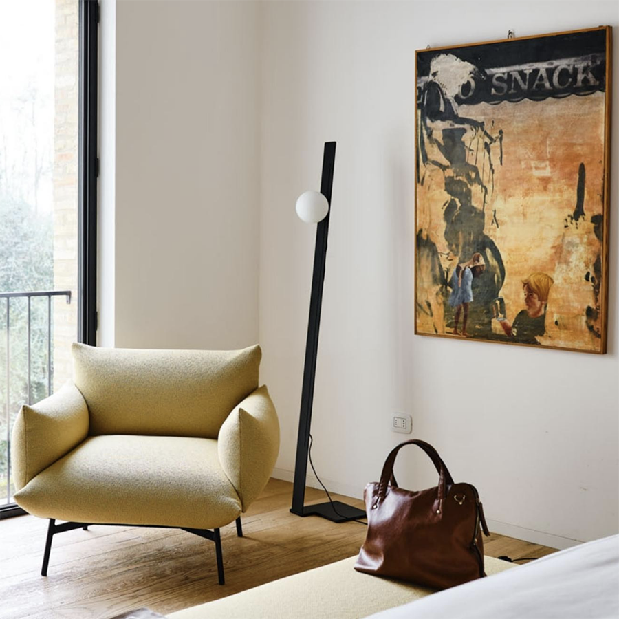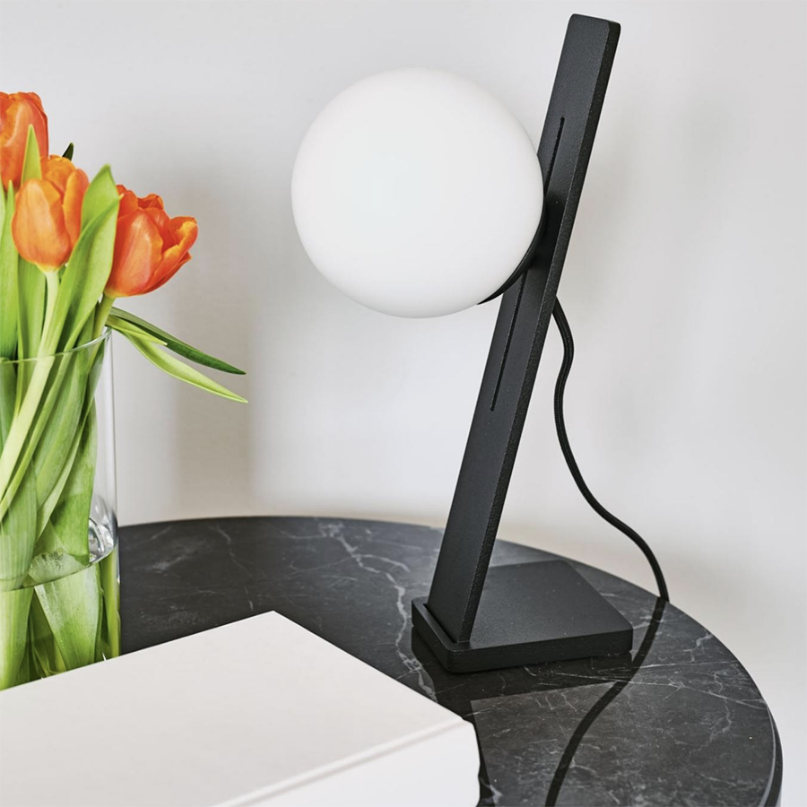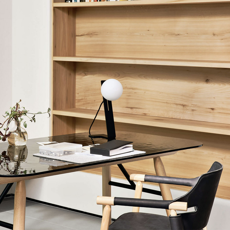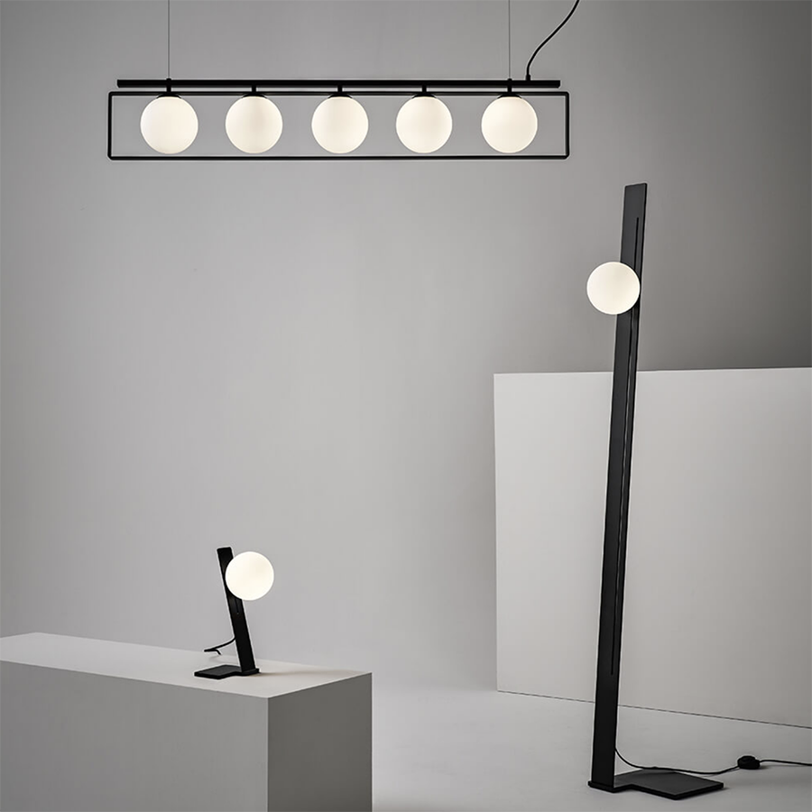 Die Suspense-Kollektion schlägt ein Spiel der Balance vor, indem sie klassische und zeitgenössische Formen kombiniert. Weiße Opalkugeln gleiten entlang eines Stahlbandes oder innerhalb eines schwarzen Rechtecks in einer Übung in zeitlosen Formen. Bei den Versionen Steh- und Tischleuchte ist es möglich, die Höhe des Diffusors einzustellen, der vollständig aus Milchglas besteht, um eine zarte und suggestive Beleuchtung zu gewährleisten.