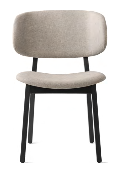 Stuhl CLAIRE mit Massivholzrahmen und gepolsterter Sitzfläche. Breite Rückenlehne.
