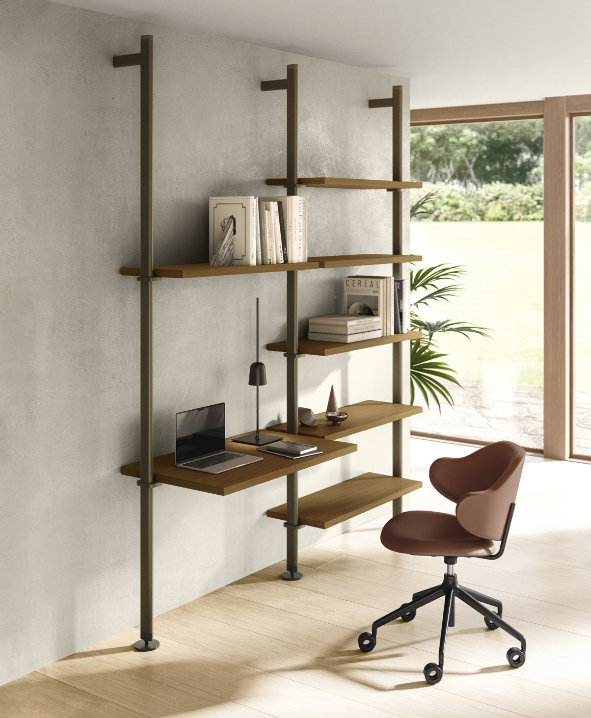 Das Bücherregal Cluster entstand aus dem Bedürfnis, ein modulares, vielseitiges und multifunktionales Bücherregalsystem zu schaffen. Ein hochflexibles Einrichtungssystem, das allen Designansprüchen gerecht wird – sowohl ästhetisch als auch funktional. Die doppelseitige Ausführung jedes Elements ermöglicht die Verwendung als freistehender Raumteiler. Dieses multifunktionale System wird durch die Vielzahl der Module erreicht, die es umfasst, darunter kippsichere Behälter, Vitrinen, Regale, Schubladenelemente und Schreibtischplatten sowie eine Reihe integrierter Accessoires wie Spiegel und Kleiderbügel. Es ist außerdem in zwei ästhetischen Varianten erhältlich, da die Pfosten für die Befestigung an der Decke oder Wand konzipiert sind. Die Regale sind in Holz und Blech erhältlich und ermöglichen so vielfältige Farb- und Gestaltungsmöglichkeiten. All dies, kombiniert mit der Liebe zum Detail, macht Cluster zu einem Produkt, das für individuelle Anpassung und große kreative Freiheit steht.