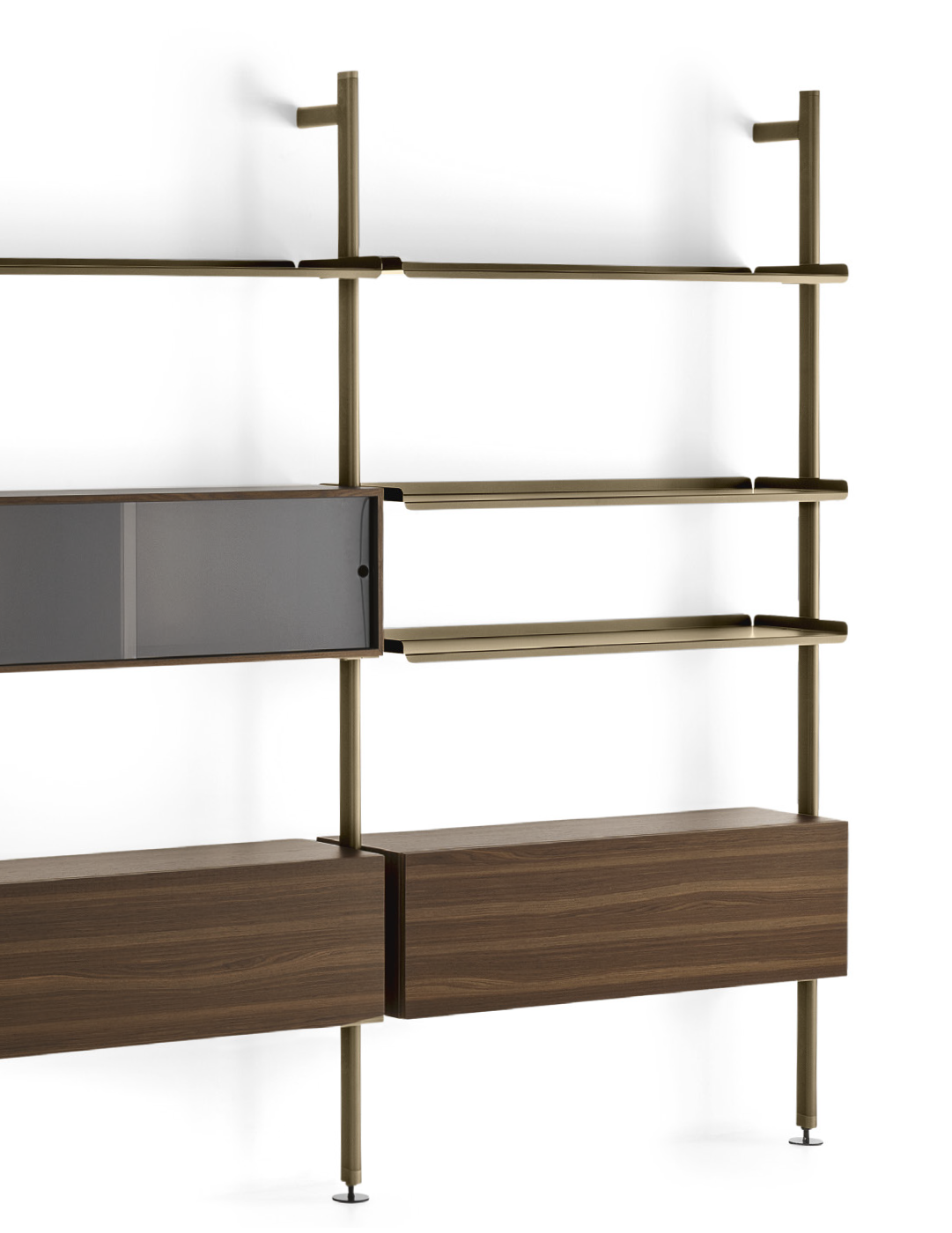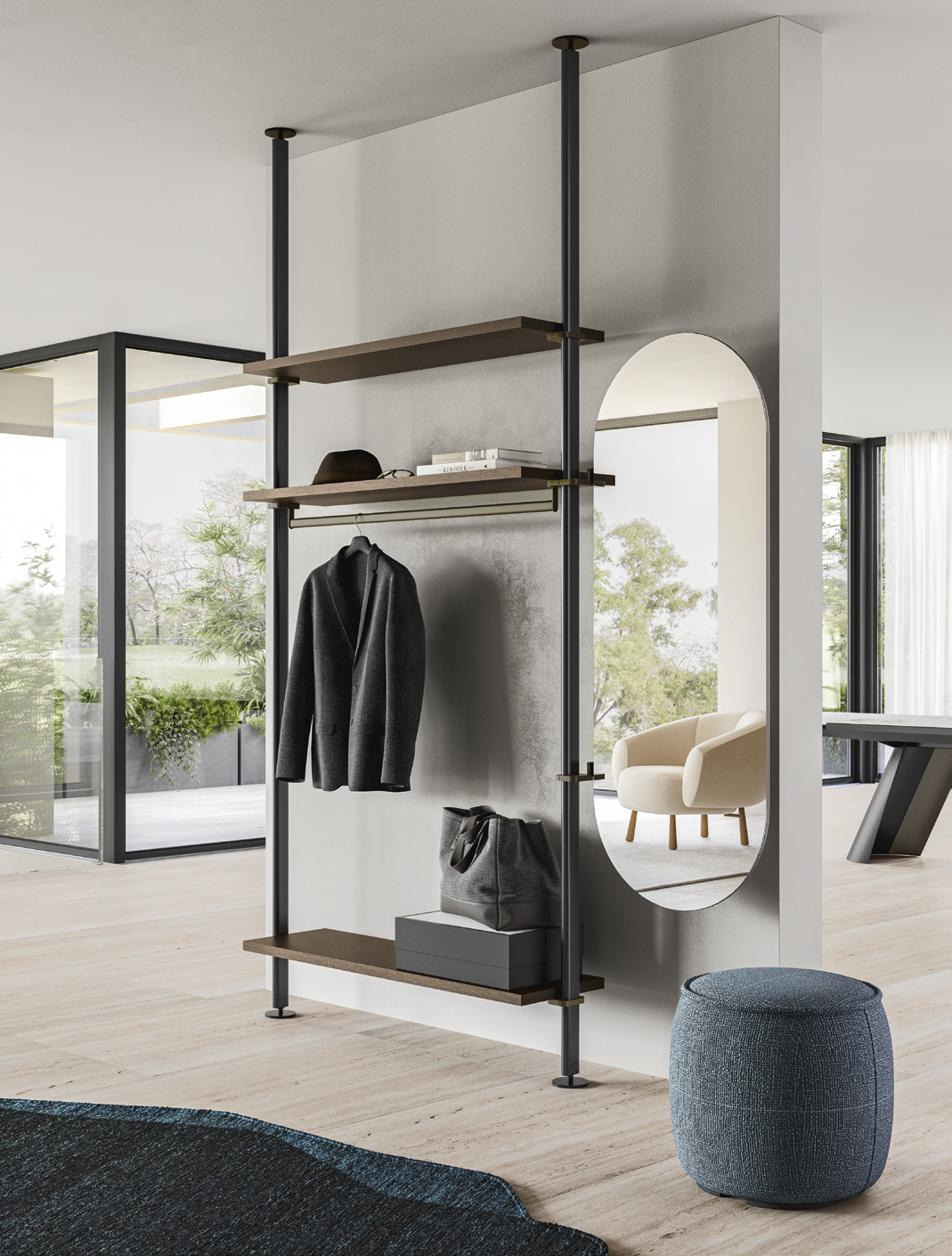 Cluster ist ein System zur Gestaltung von Bücherregalen sowie Möbeln für den Wohnbereich, das Home Office und den Eingangsbereich. Maximale Gestaltungsfreiheit: Je nach Bedarf können die Wand- oder Deckenschienen mit Metall- oder Holzregalen, Schränken mit Klapptüren oder Vitrinen, Schreibtischen oder Garderobenständern mit Drehspiegeln ausgestattet werden.
