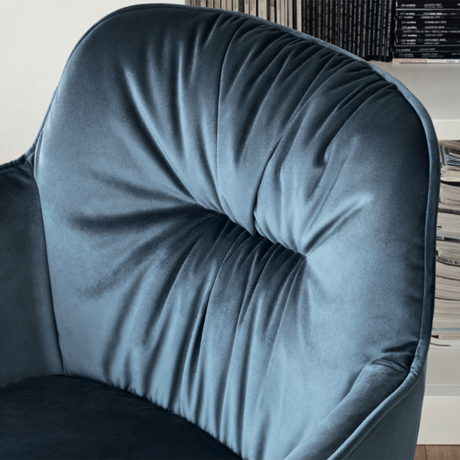 Der Sessel COCOON entstand mit der klaren Absicht, ein Modell zu schaffen, das die Formen der Sessel der 1960er Jahre aufgreift, jedoch mit moderneren und zeitgenössischeren Linien. Großzügige Abmessungen und Dicken sorgen für einen bequemen und einladenden Sitz. Die weichen, plissierten Stoffoberflächen unterstreichen den weichen, umhüllenden Effekt mit einem Hauch von Retro.