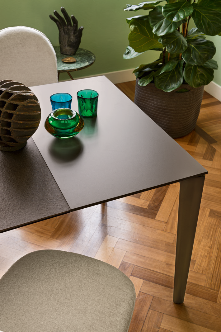 Artic CB4855-R Tisch mit Melaminplatte (mit Melaminverlängerungen) oder Keramikplatte (mit Melaminverlängerungen) und Metallgestell. Der Artic Tisch ist in verschiedenen Größen mit einer oder mehreren Verlängerungen erhältlich und passt sich so jedem Raum und Stil an. Der Tisch ist manuell ausziehbar; die Verlängerungen werden angehoben und auf Höhe der Hauptplatte positioniert, während die Tischbeine immer am Rand bleiben.