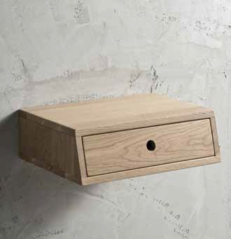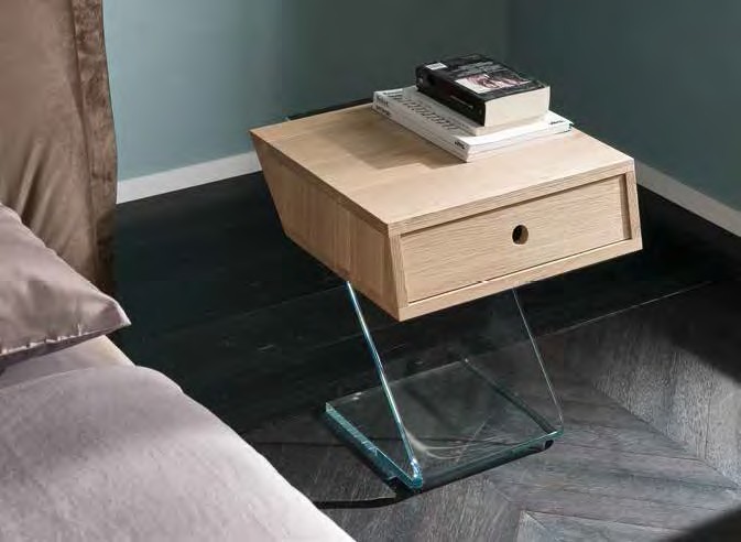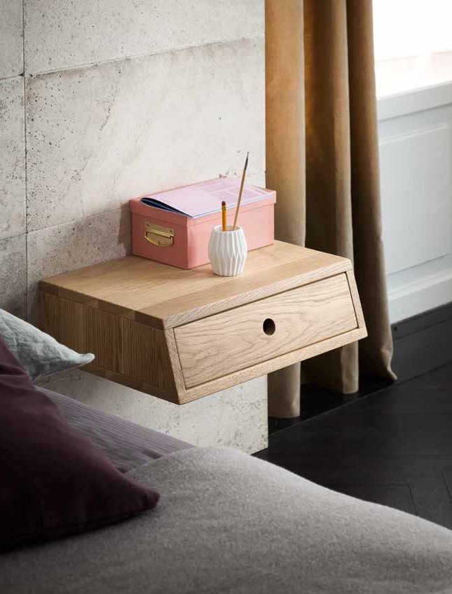 Cut Nachttisch von Altacorte aus Eichenholz in verschiedenen Ausführungen. Dieser Nachttisch mit einfachen Linien verfügt über eine Schublade mit schräger Front, die Ihrem Schlafzimmer eine einzigartige Note verleiht. Erhältlich in zwei Versionen: wandmontiert oder mit „Z“-förmiger Glashalterung.