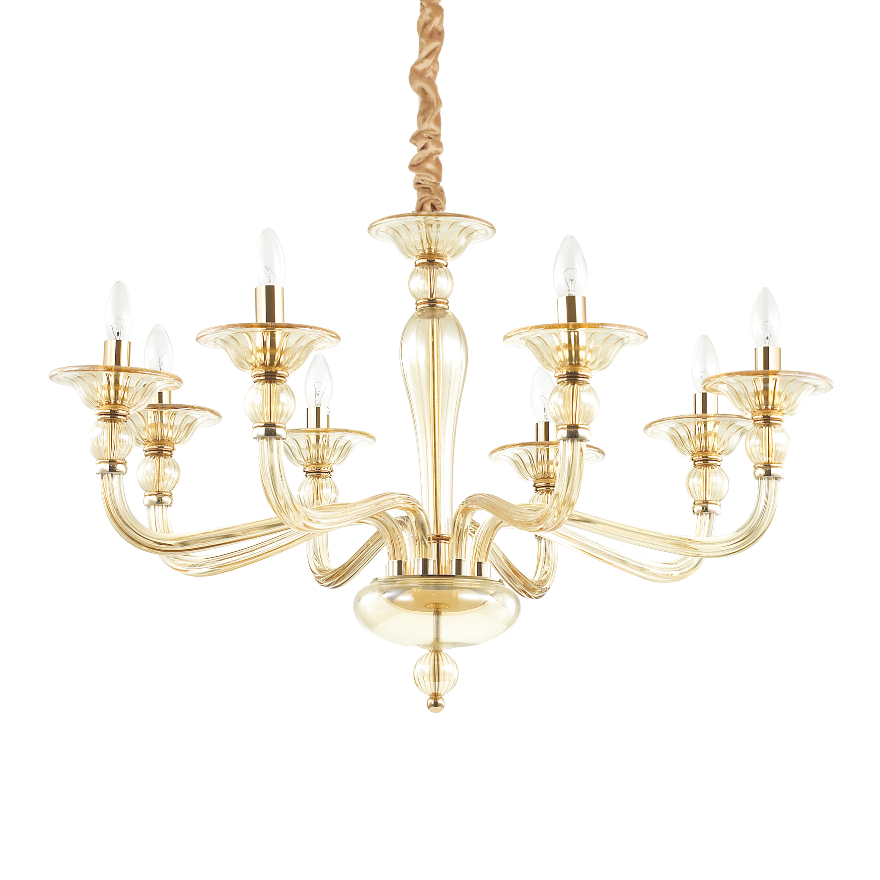 DANIELI SP8 Bernstein-Hängeleuchter von Ideal Lux mit goldenem Metallrahmen. Dekorative Elemente aus bernsteinfarbenem mundgeblasenem Glas. Kettenüberzug aus Samt. Leuchtmittel ausgeschlossen.