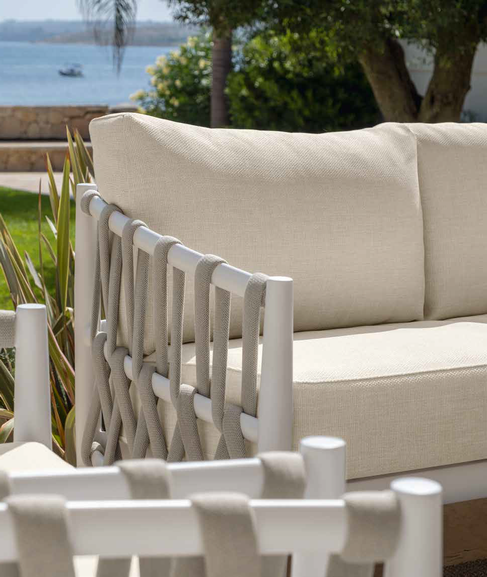 Tess ist eine Outdoor-Kollektion, die aus der Verbindung der Robustheit von Aluminium und der optischen Weichheit von gewebtem Seil entstanden ist. Klare Linien, schwebende Formen und natürliche Texturen prägen ein zeitgenössisches Design, das Wärme und Präsenz ausstrahlt.