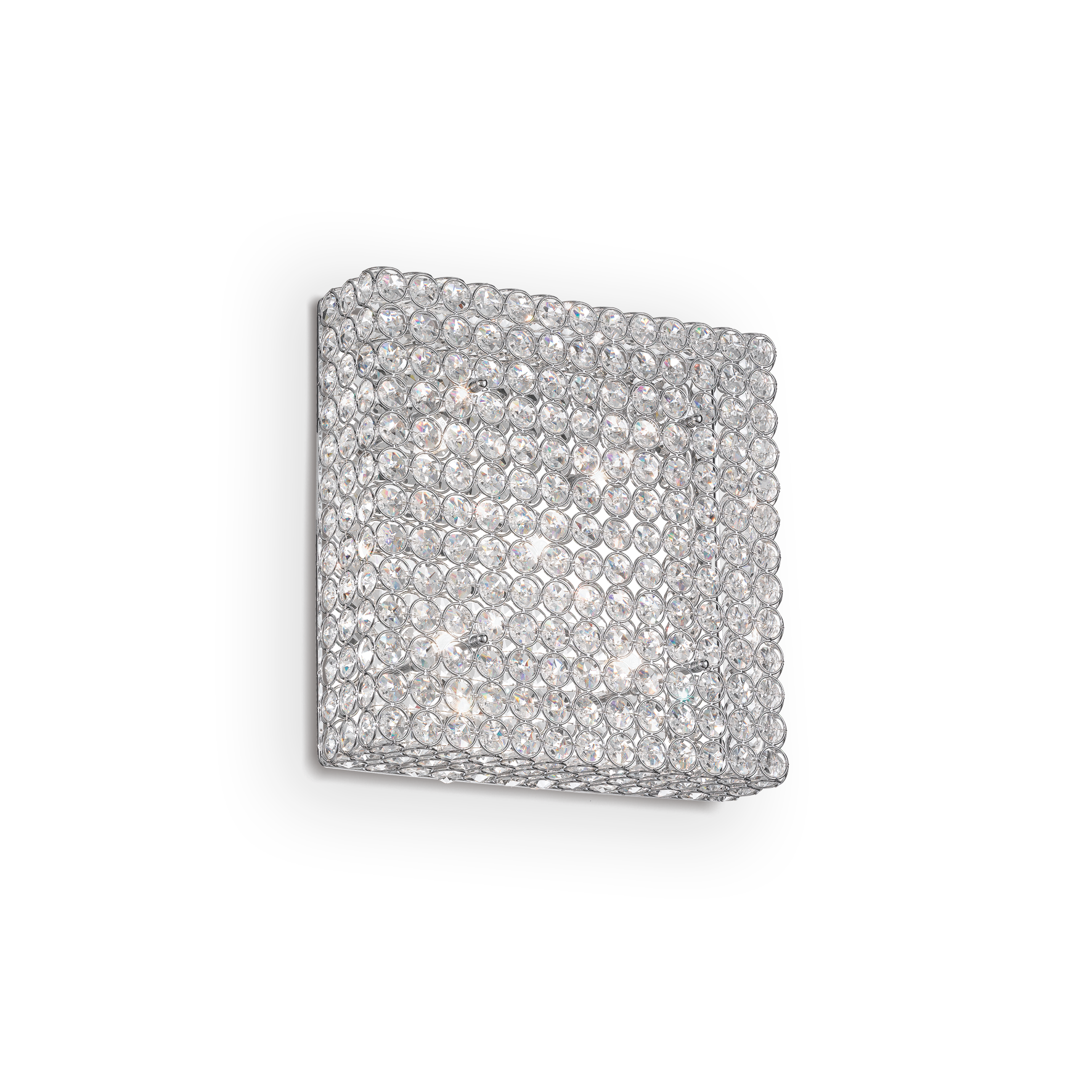Admiral Ideal Lux Decken-/Wandleuchte, bestehend aus einem quadratischen Diffusor aus zusammengeschweißten Metallringen und darin eingelassenen geschliffenen Kristallelementen. Gestell aus verchromtem Metall. Eine Decken-/Wandleuchte mit modernem und brillantem Design, perfekt für die Einrichtung und Beleuchtung mit Eleganz. Glühbirnen im Lieferumfang enthalten.