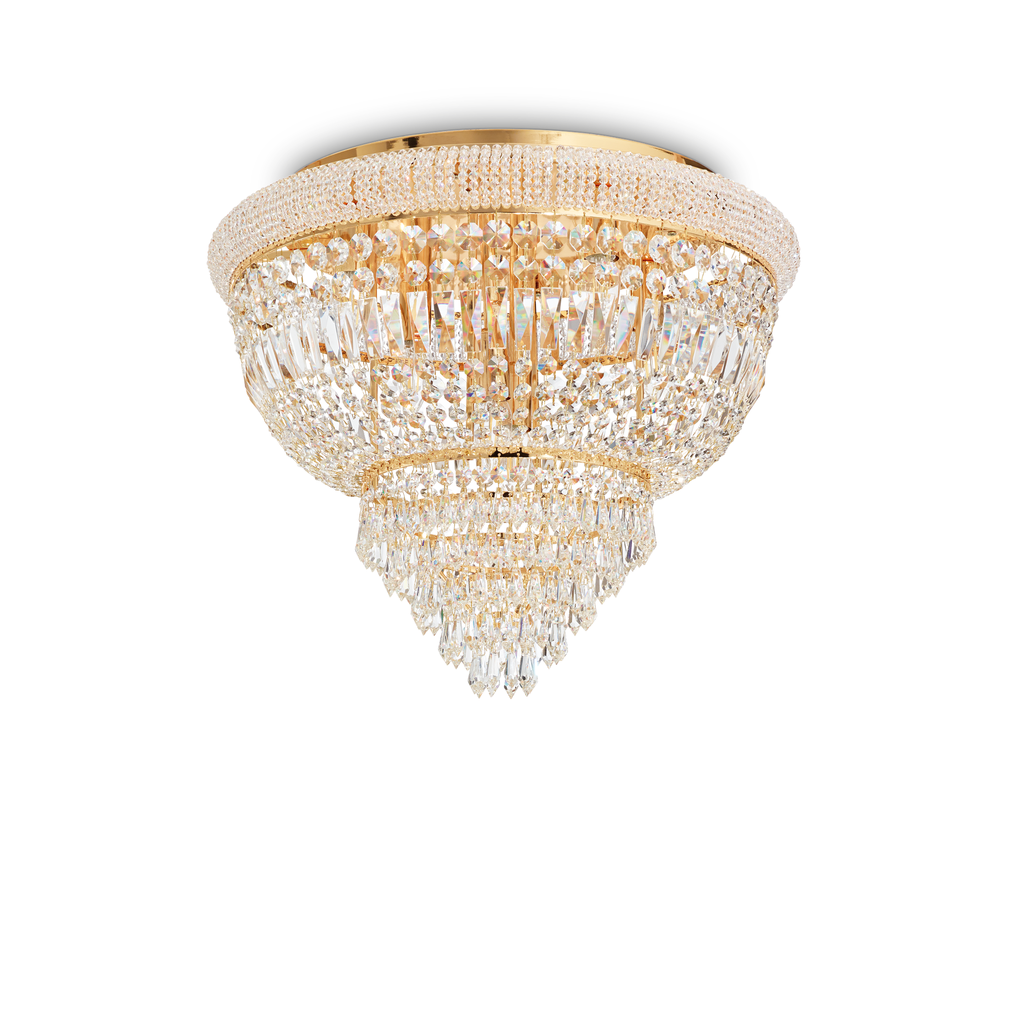 Deckenleuchter DUBAI PL6 aus Messing von Ideal Lux mit Metallrahmen mit Messingoberfläche. Dekorative Elemente mit Perlen, Achtecken und Prismen aus transparentem geschliffenem Kristall. Leuchtmittel ausgeschlossen.