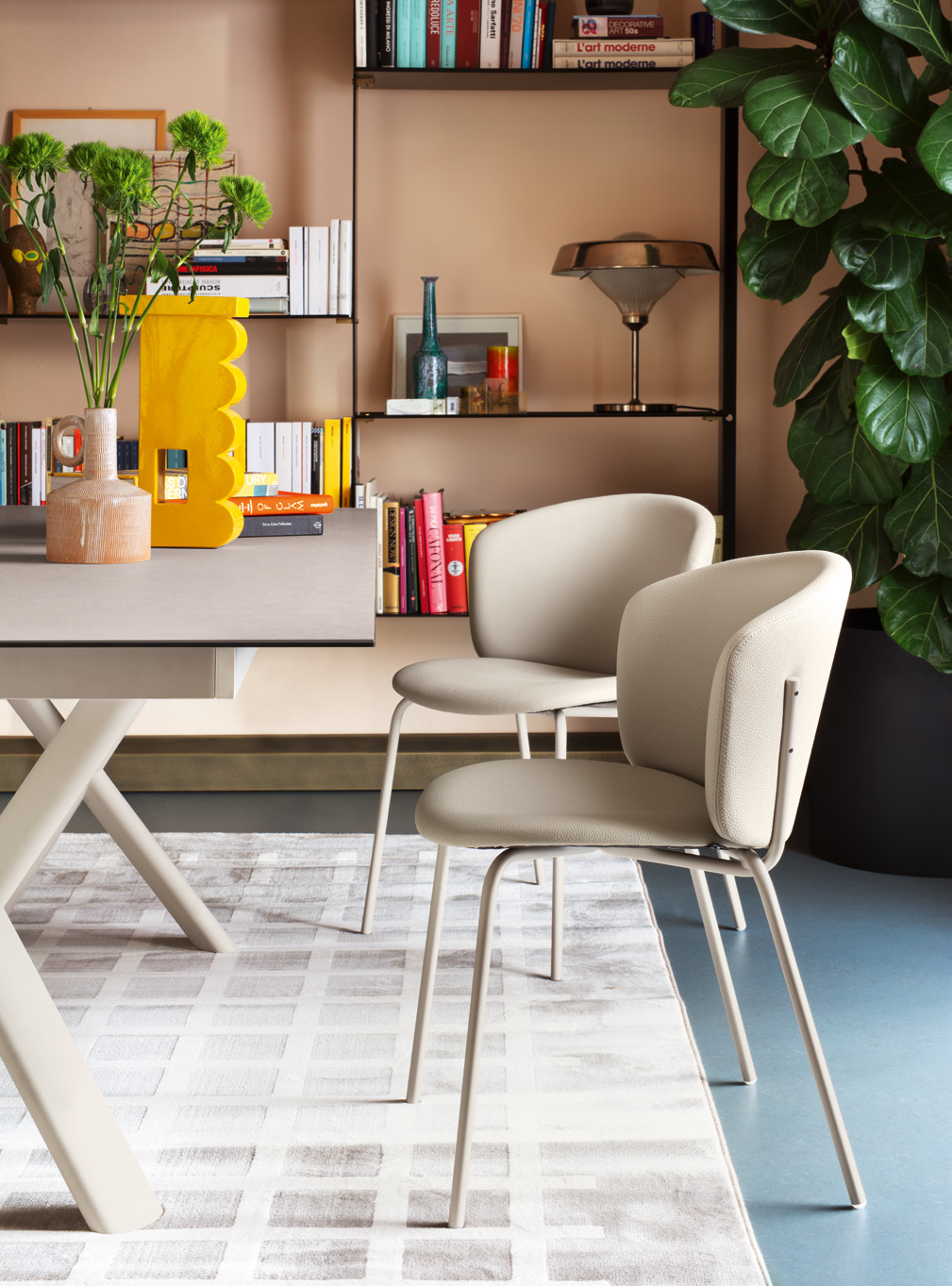 In dieser neuen Version wird Desy durch noch größeren Komfort bereichert, da die Rückenlehne bis zur Sitzfläche reicht, den Körper elegant umhüllt und hohen Halt bietet. Die faszinierende Überlappung der Rohre, aus denen die Struktur besteht, und die weichen Formen der Schalen bleiben unverändert und bewahren die raffinierte Harmonie, die an den Stil der 50er Jahre erinnert. Einladend und komfortabel fügt sich Desy perfekt in jeden Kontext ein.