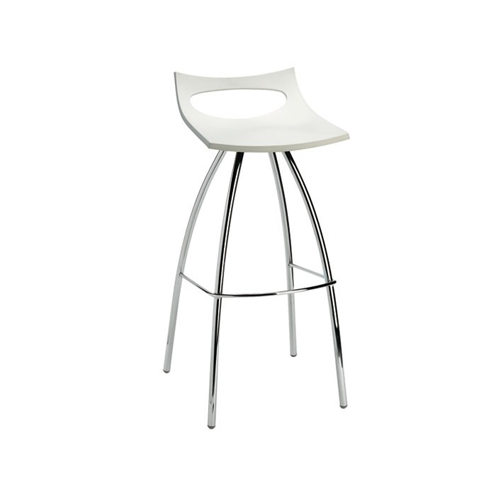 Feststehender Hocker mit verchromtem Stahlgestell, erhältlich in zwei Höhen, 65 cm oder 80 cm, die Sitzfläche besteht aus Technopolymer und ist in verschiedenen Farben erhältlich.