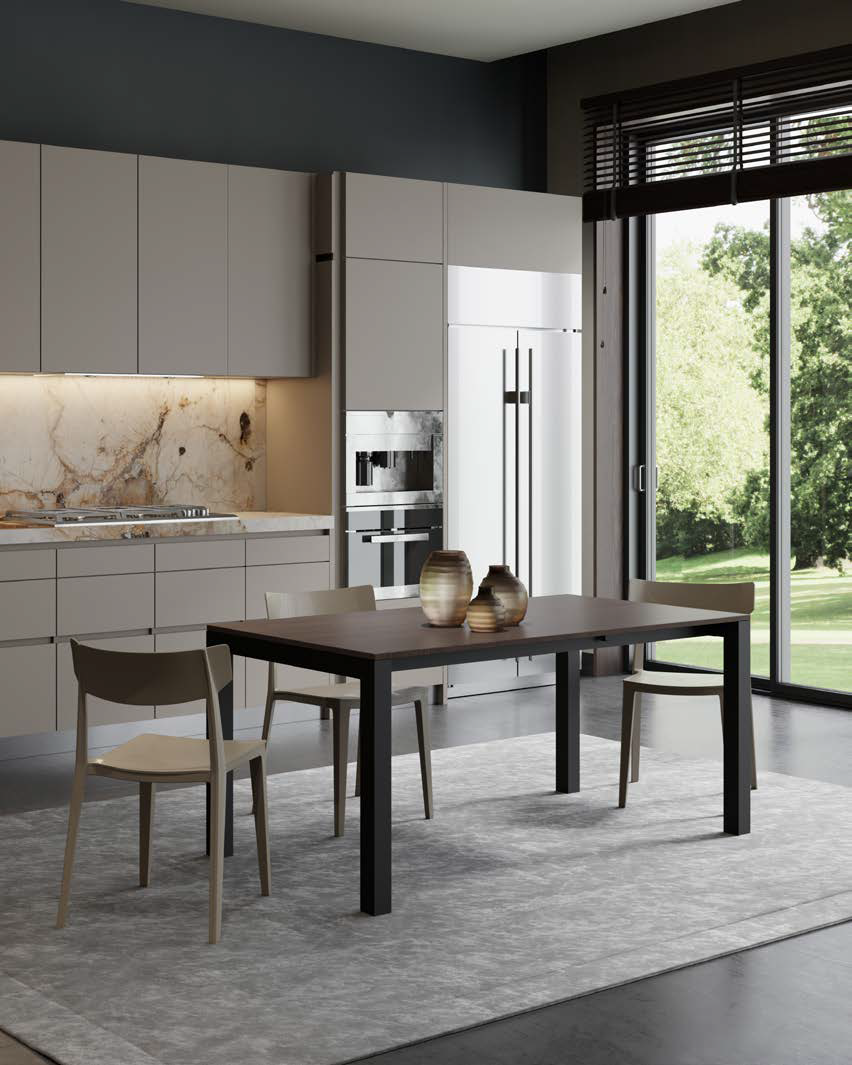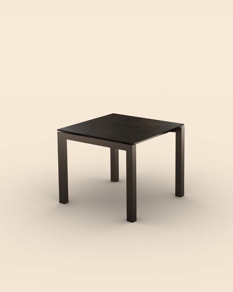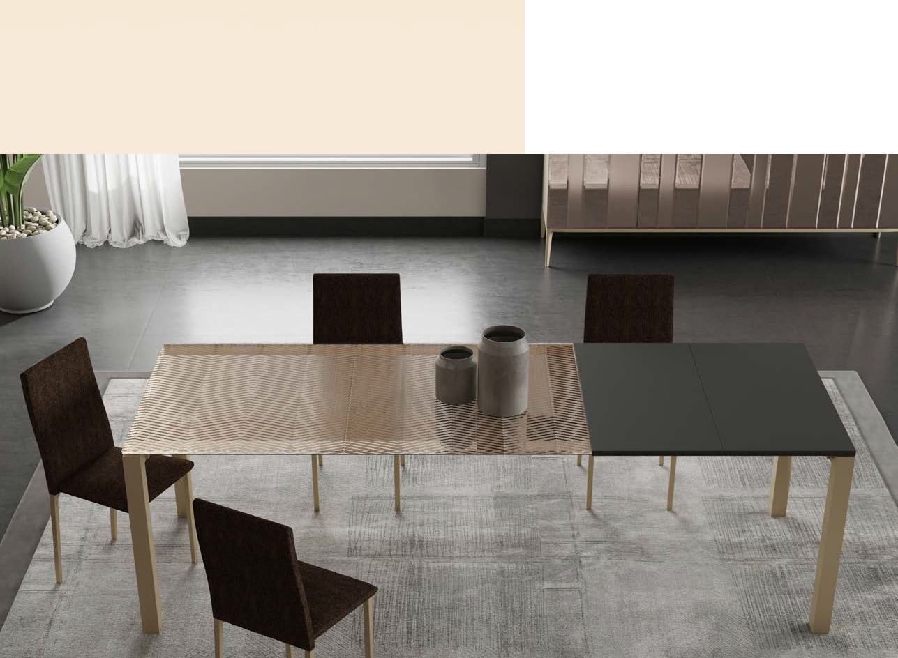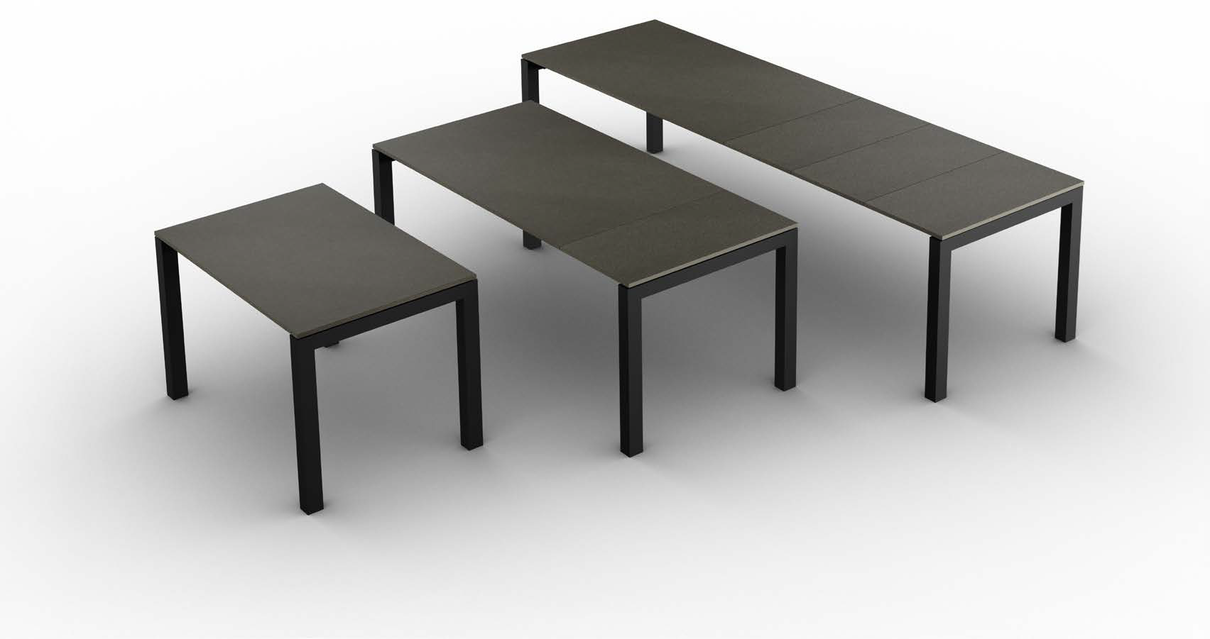 Ausziehbarer oder fester Tisch mit patentierter Teleskop-Ausziehführung aus Aluminium, mit Beinbrücke aus lackiertem Metall in verschiedenen Ausführungen mit Platte und Verlängerungen in verschiedenen Materialien und Ausführungen.