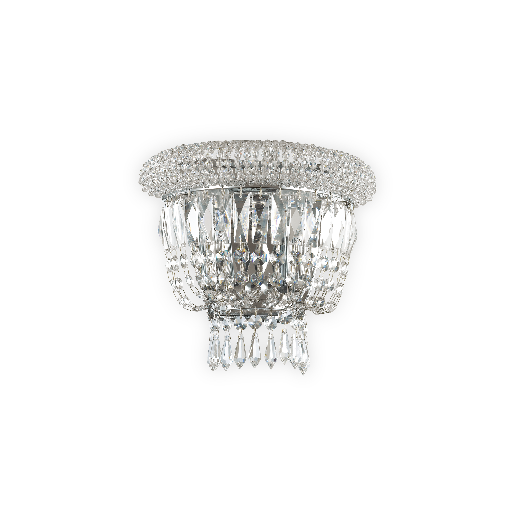 DUBAI AP2 Chrom-Wandleuchte von Ideal Lux mit Metallrahmen mit Chrom-Finish. Dekorative Elemente mit Perlen, Achtecken und Prismen aus transparentem geschliffenem Kristall. Leuchtmittel ausgeschlossen.