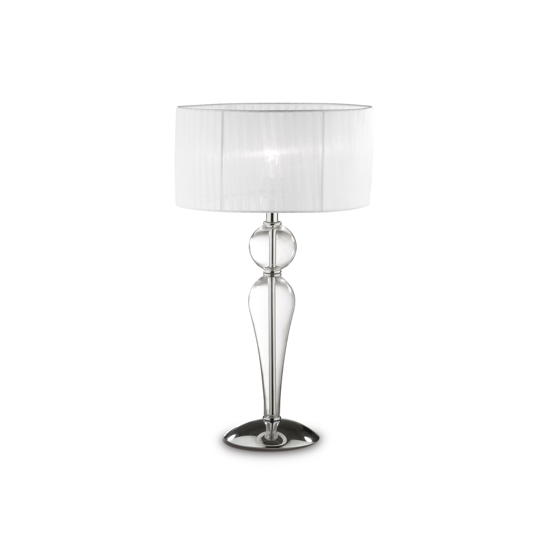 DUCHESSA TL1 BIG Tischleuchte von Ideal Lux mit verchromtem Metallsockel und Details. Dekorative Elemente aus mundgeblasenem und handgefertigtem Glas. Lampenschirm aus plissiertem Organzastoff. Glühbirne ausgeschlossen. Lampe mit integriertem Schalter.