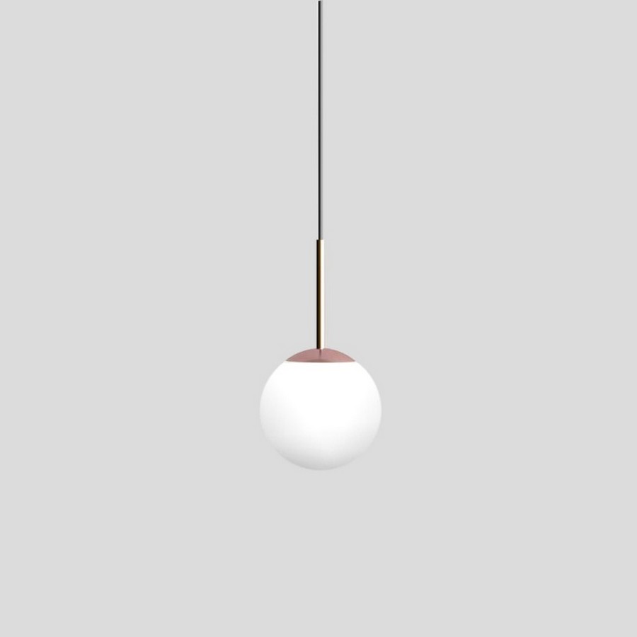 Eclypse-Hängeleuchte mit Titanstruktur und taubengrauer Murano-Glaskugel oder mit roségoldener Struktur und weißer Glaskugel. Hellgraues Stoffkabel.