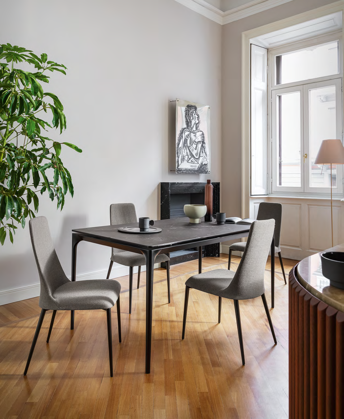 Die Etoile-Kollektion ist für den klassischen Wohnbereich konzipiert. Die Stuhlschale mit Holz- oder Metallgestell verfügt über eine hohe, dünne Rückenlehne aus weichem Polyurethan, einem Material, das für dauerhaften Komfort sorgt. Das gleiche Profil findet sich auch beim Hocker wieder.