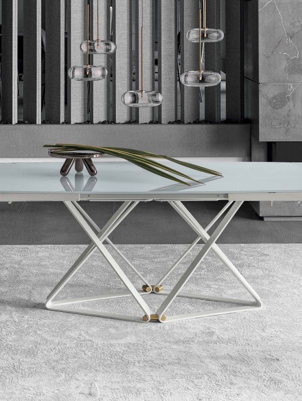 Die Struktur zeichnet sich durch geometrische Linien aus, die an das Thema des Tisches mit gekreuzten Beinen erinnern und es mit Leichtigkeit und wertvollen Details neu interpretieren, die seine starke Persönlichkeit unterstreichen. Aus lackiertem Stahl kann er in verschiedenen Ausführungen angeboten werden, die von Antikmessing über Gold bis hin zu Schwarz und Weiß, matt oder glänzend reichen.