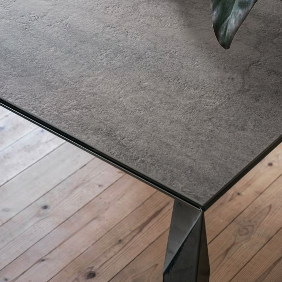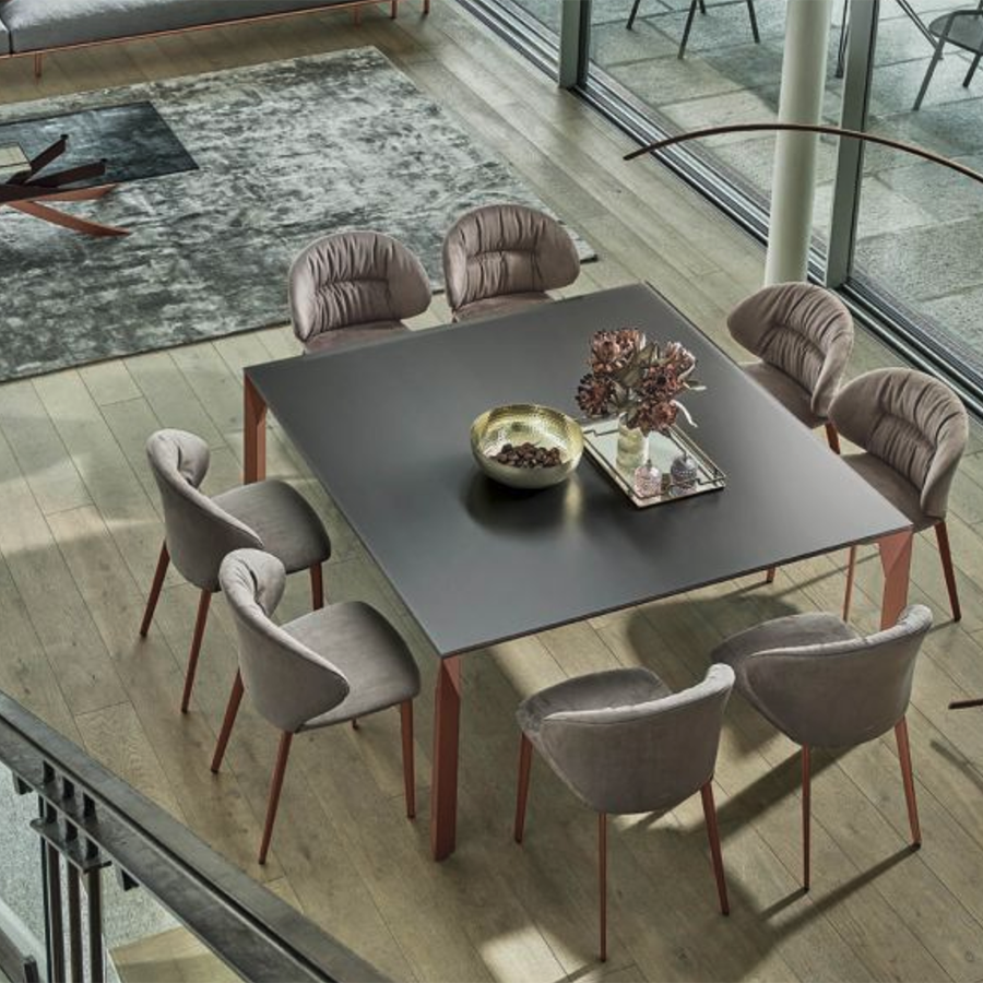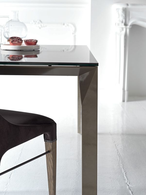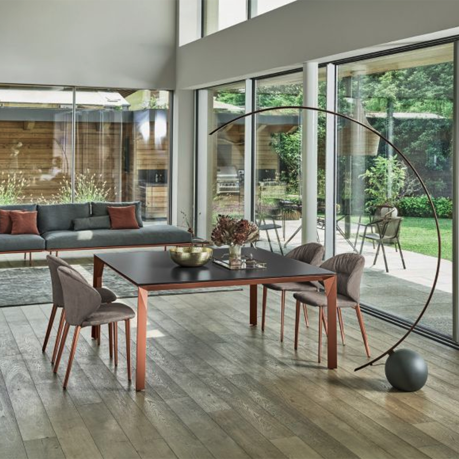 Der Mirage-Tisch von Bontempi ist in quadratischer oder rechteckiger Ausführung erhältlich. Die diamantgeschliffenen Facetten der Tischbeine verleihen ihm eine leichte, elegante Anmutung und harmonieren perfekt mit der Stabilität und Festigkeit des Aluminiums – ein einzigartiges Möbelstück.