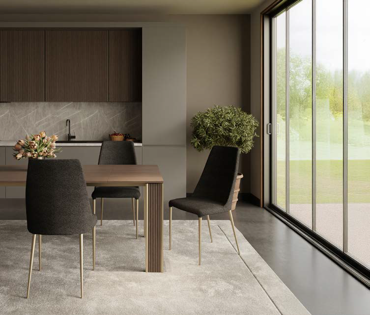 Fester oder ausziehbarer Tisch mit patentierter Teleskopführung aus Aluminium, Basis aus lackiertem Metall in verschiedenen Ausführungen und geriffeltem Einsatz, mit Platte und Verlängerungen in verschiedenen Materialien und Ausführungen.