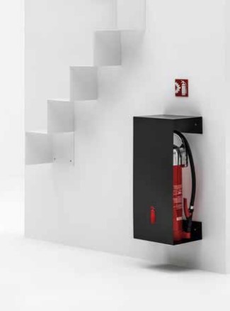 Feuerlöscherabdeckung aus 3 mm dickem Metall, epoxidlackiert, erhältlich in drei Farben mit aufgedruckten Erkennungssymbolen und roter Plexiglasplatte zum Aufhängen an der Wand. Ein wirklich minimalistisches Design ohne sichtbares Befestigungssystem. Erhältlich in zwei Größen.