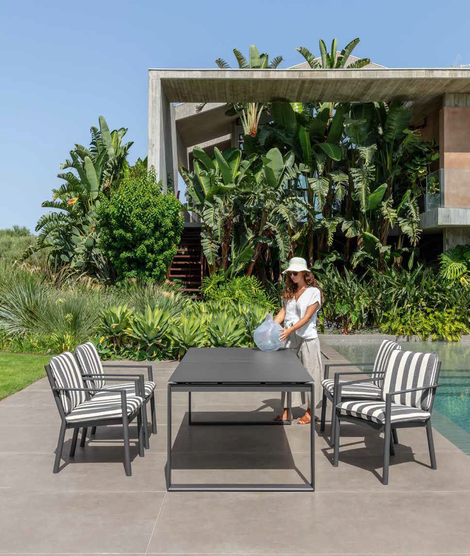 Der Esszimmer-Sessel vereint optische Leichtigkeit und modernen Komfort in einem schlichten und dennoch raffinierten Design. Das lackierte Aluminiumgestell trägt eine gepolsterte Sitzfläche und Rückenlehne, die mit einem Funktionsgewebe bezogen sind, das Langlebigkeit und Pflegeleichtigkeit auch im Außenbereich gewährleistet. Die geometrischen Linien und die schlanken Armlehnen erzeugen eine elegante und harmonische Form, die sich perfekt als Ergänzung zu Esstischen auf Terrassen, Veranden und in Objektbereichen mit einem zurückhaltenden und zeitlosen Stil eignet.