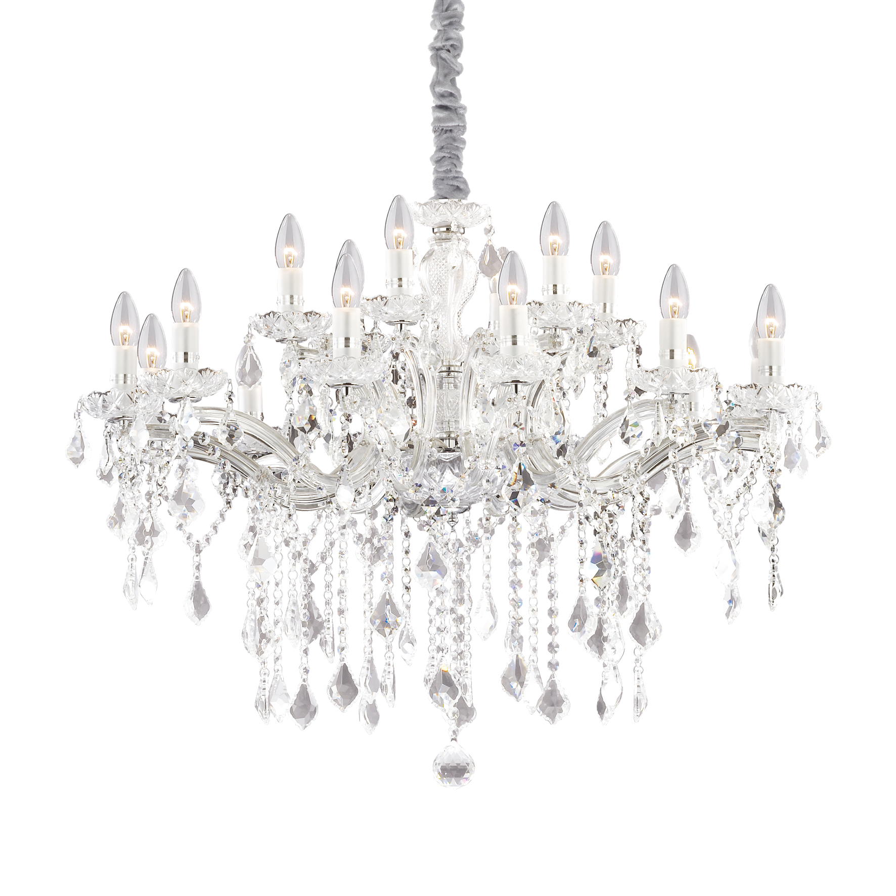 Metallrahmen mit dekorativen Glaselementen. Anhänger mit Achtecken und geschliffenen Kristalltropfen. Erhältlich in Klarglas und verchromter Ausführung. Leuchtmittel nicht enthalten.