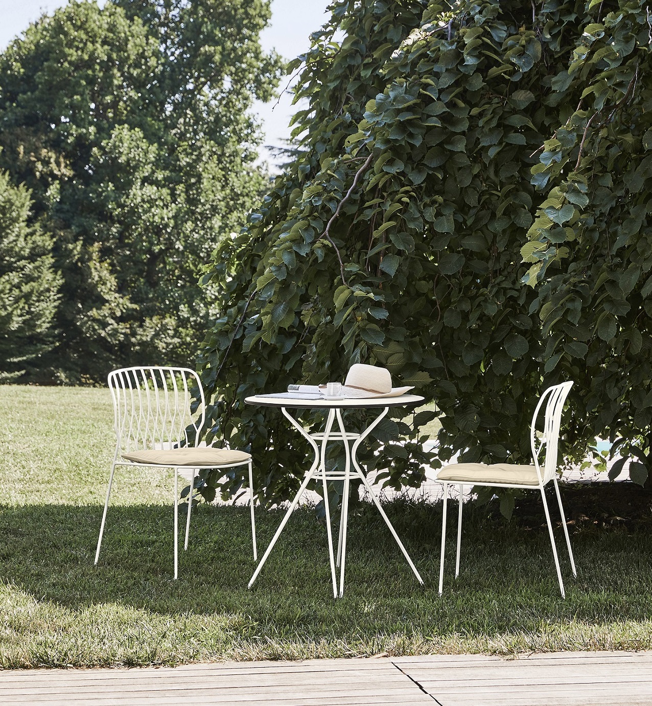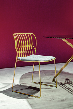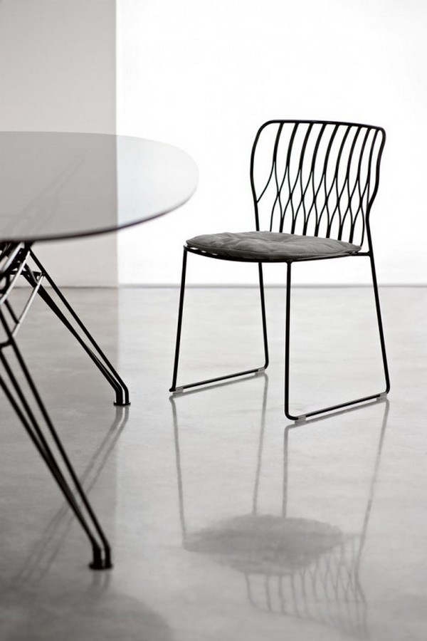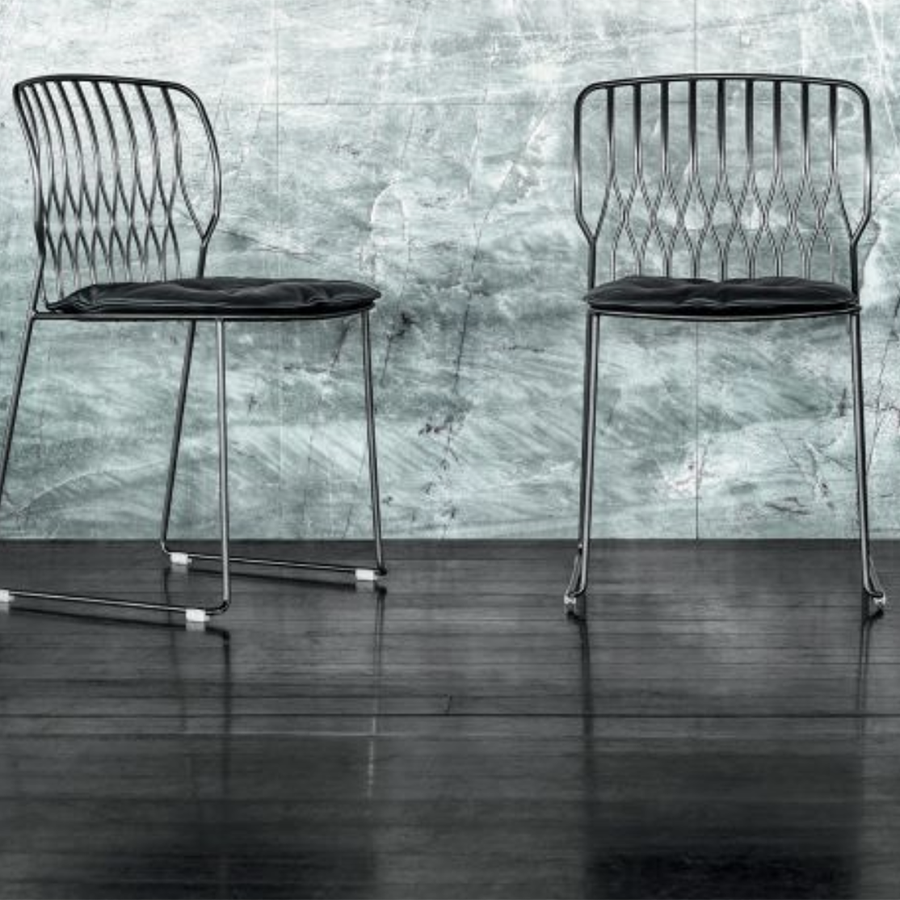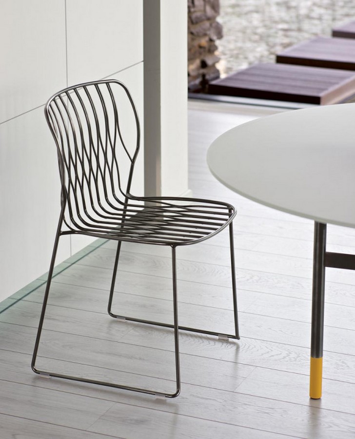 Freak-Stuhl von Bontempi mit einer Struktur vollständig aus lackiertem Stahl, erhältlich in verschiedenen Ausführungen für den Innen- und Außenbereich mit optionalem Sitzkissen. Er ist stapelbar und hat einen eleganten Stil. Er eignet sich gut, um Ihren Innenräumen wie Esszimmern oder Wohnbereichen einen Hauch von Klasse zu verleihen.