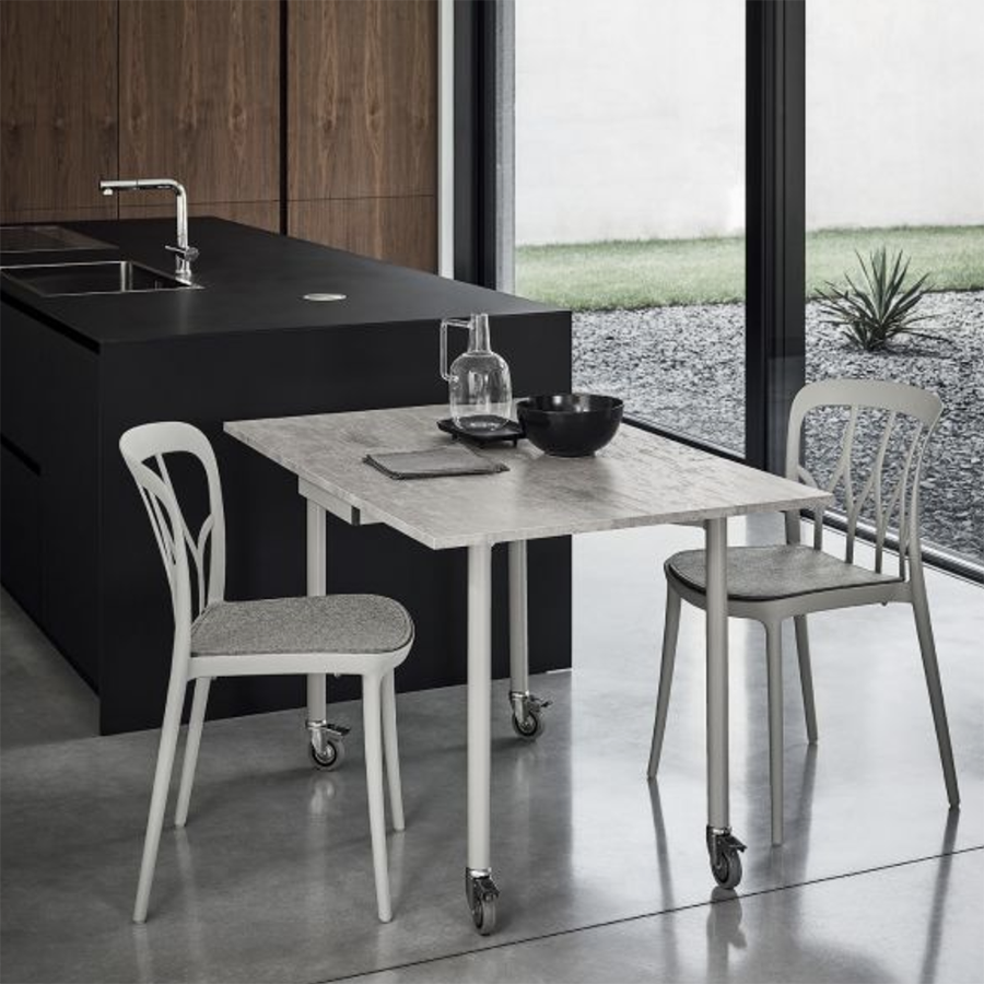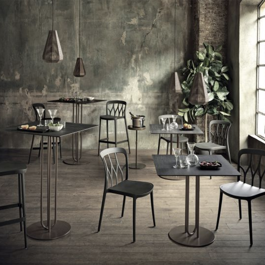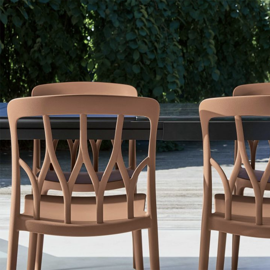 Stapelbarer Stuhl mit oder ohne Armlehnen, integrierte Struktur aus Polypropylen und recycelbarem Fiberglas in verschiedenen Farben. Für den Innen- und Außenbereich konzipiert.