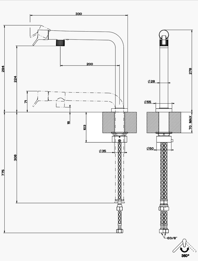 Mischerloch: Ø33,5 mm
