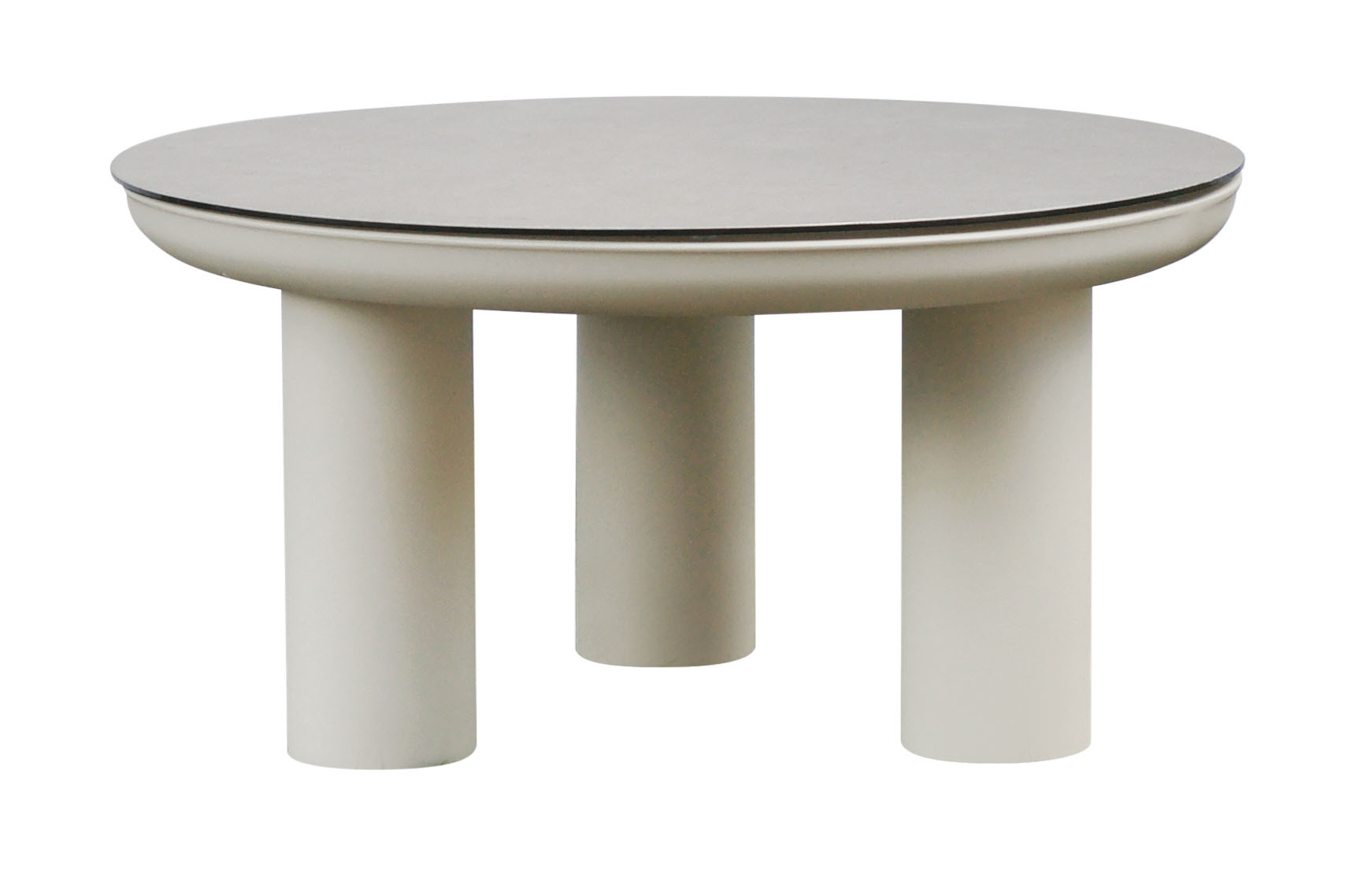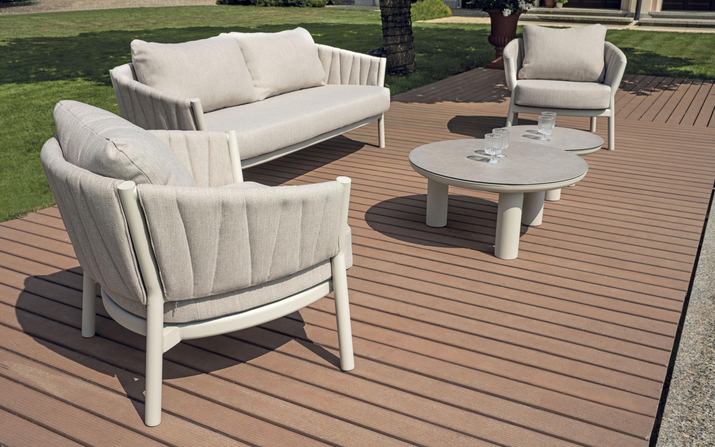 Weißer Aluminiumrahmen, graue Polsterung, graue abnehmbare Kissen.