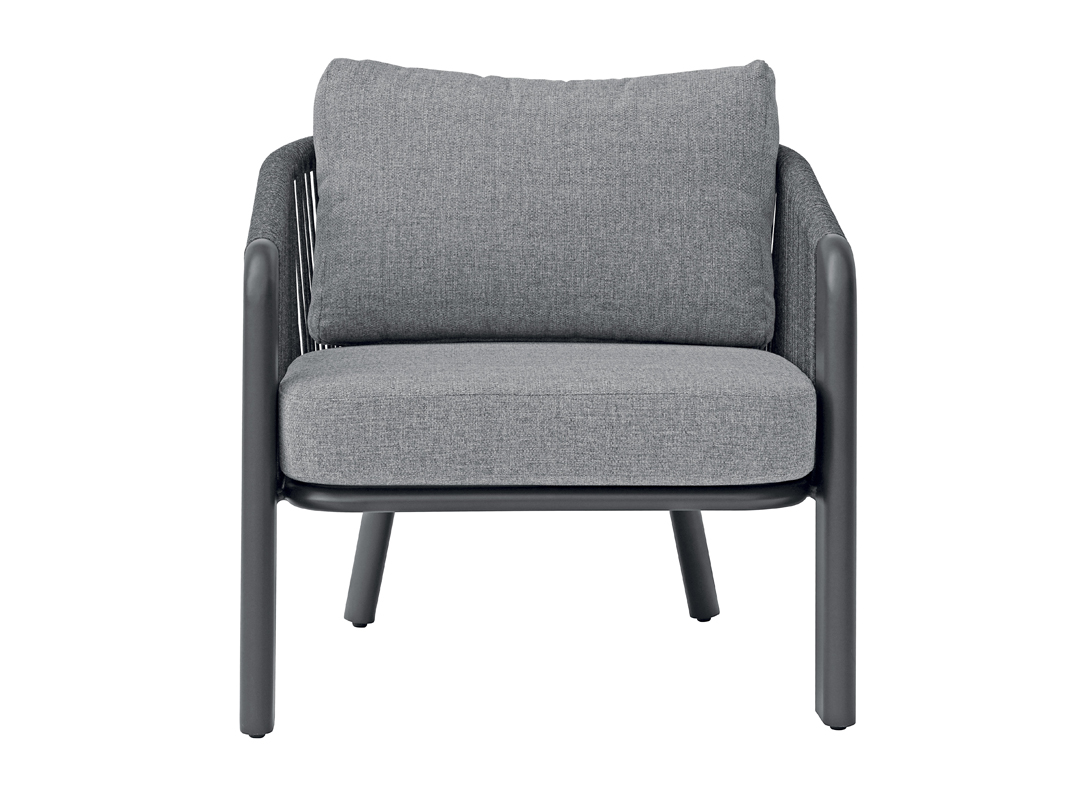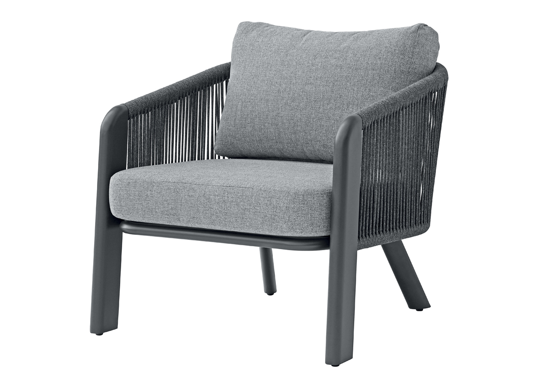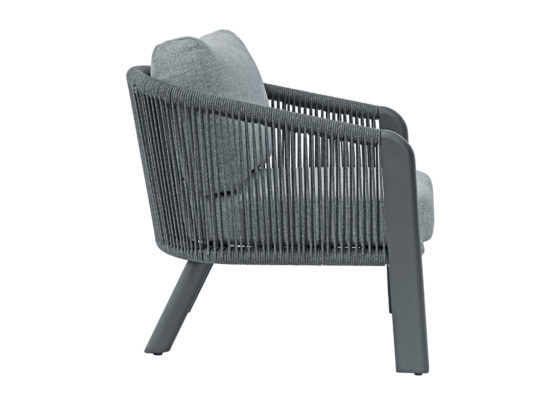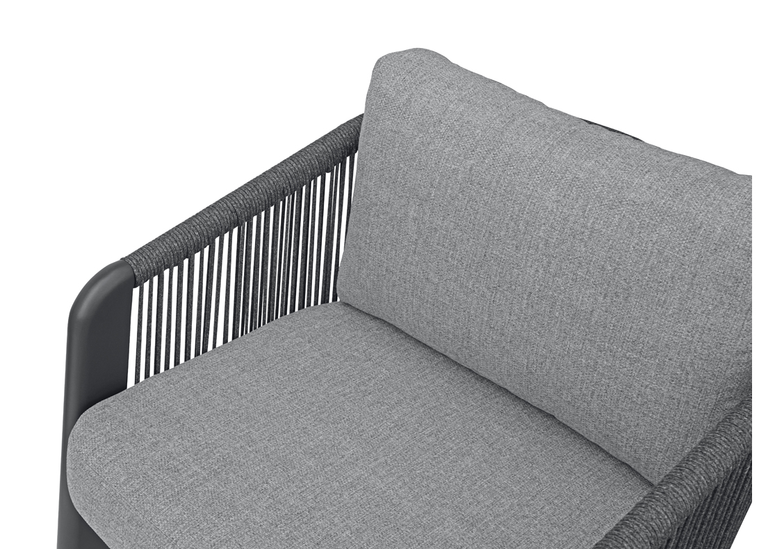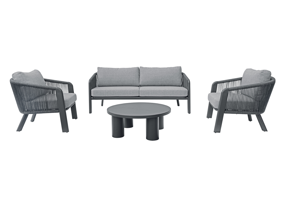Das anthrazitfarbene Aluminiumgestell in Kombination mit grauem Seil sorgt für Stabilität und Langlebigkeit, während die hellgrauen Kissen mit abnehmbaren Bezügen eine einfache Reinigung ermöglichen und dem Ensemble eine elegante Note verleihen. Der runde Tisch eignet sich perfekt zum Abstellen von Getränken, Snacks oder Dekorationen und rundet das Set funktional und stilvoll ab.