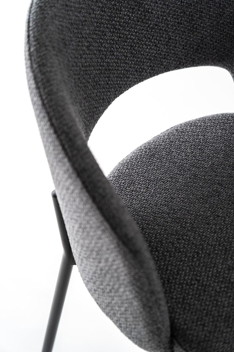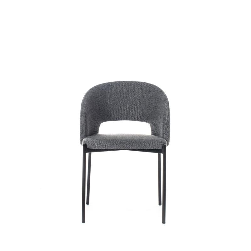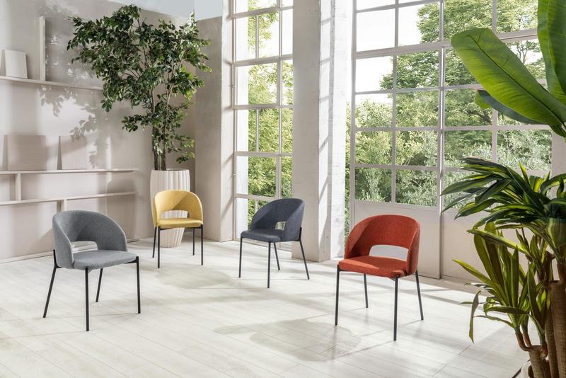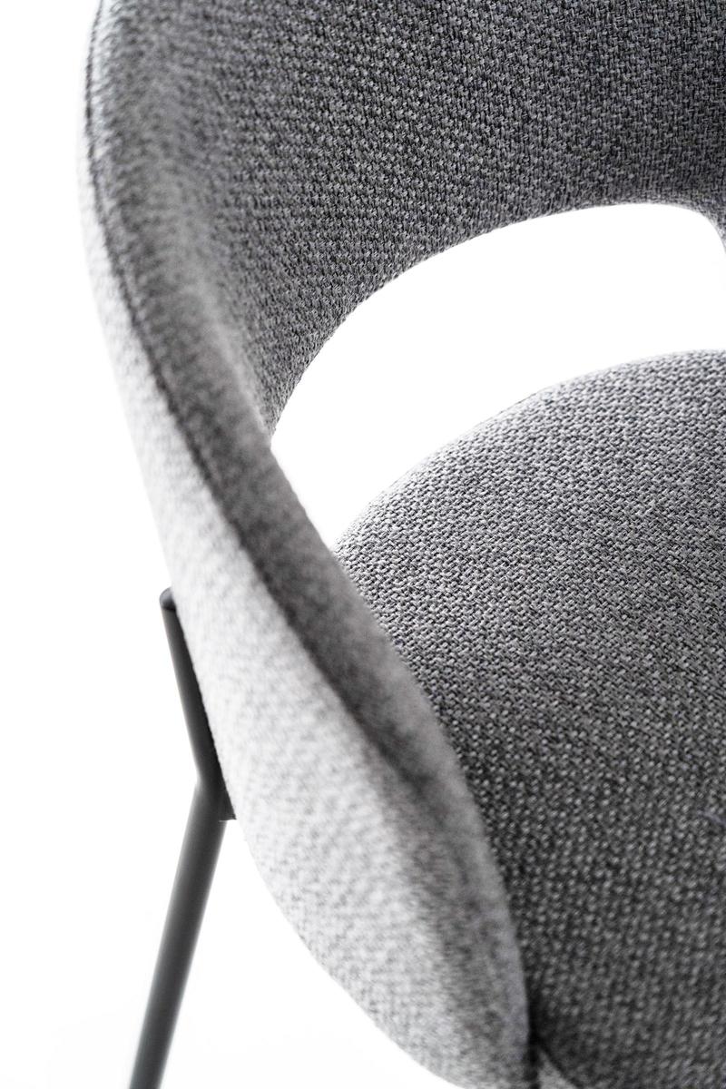 Greta, ein gepolsterter Stoffstuhl mit runder Rückenlehne, die auch ohne Armlehnen eine Struktur garantiert, die sich der Körperform anpasst, ideal zum Entspannen nach einer Mahlzeit bei einem Likör oder Kaffee.
