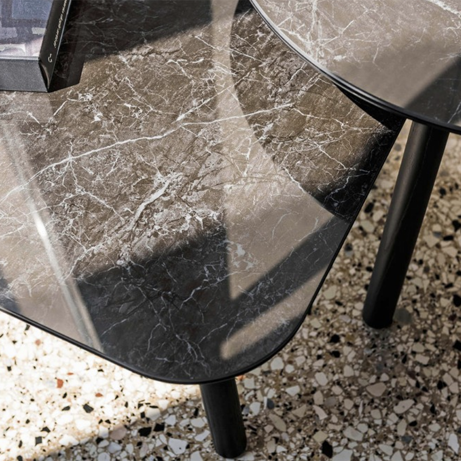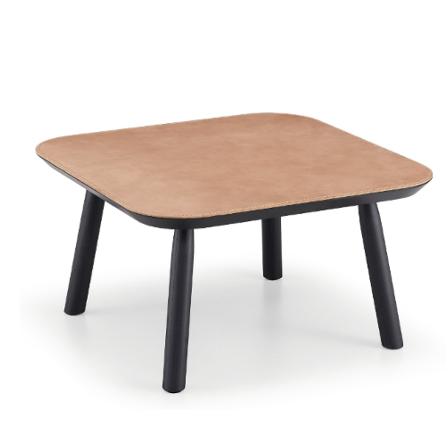 Couchtisch Suite mit vier Holzbeinen. Platte aus Keramik oder mit Leder bezogen.