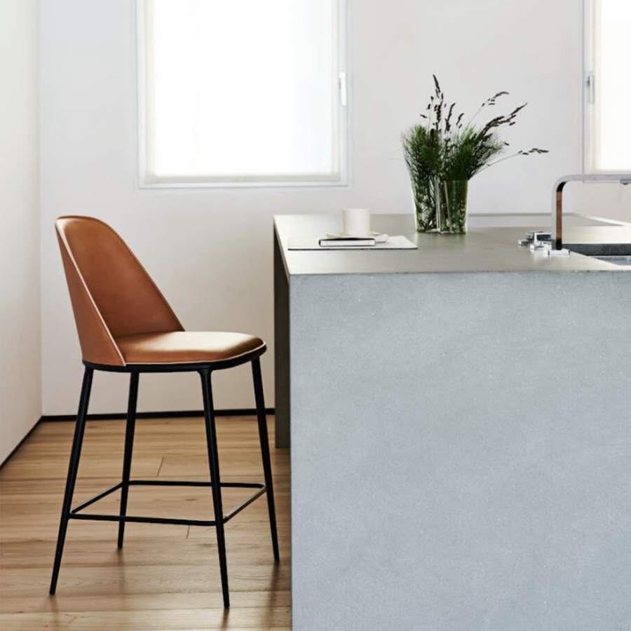 Hocker mit vierbeinigem Stahluntergestell oder mit drehbarem und höhenverstellbarem Metalluntergestell. Sitz und Rückenlehne mit Leder oder toskanischem Leder bezogen.
