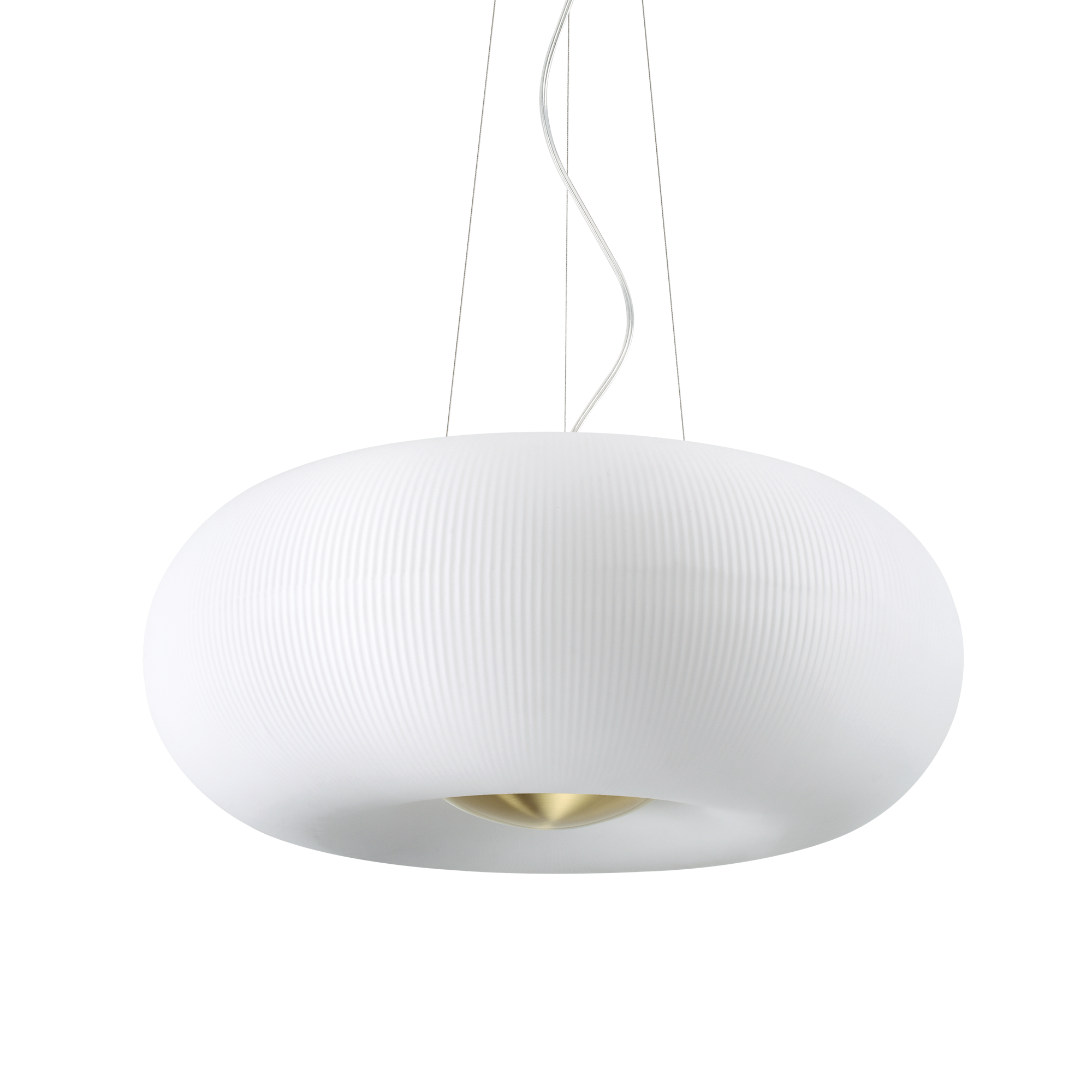 Hängender Kronleuchter Arizona SP5 mit Metallrahmen aus satiniertem Messing. Diffusor aus geblasenem weißem Glas, geätzt und mit dekorativen Reliefrillen. Glühbirnen im Lieferumfang enthalten.