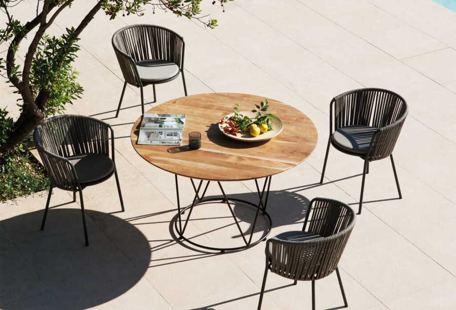 Eine Kollektion mit zeitgenössischem Geschmack, bei der die Verflechtung geometrischer Grundformen und essentieller Linien eine dynamische und funktionale Atmosphäre schafft. Das Wohnzimmer im Freien wird zu einem fließenden und manchmal traumhaften Raum, der sich perfekt in jede Umgebung einfügt.