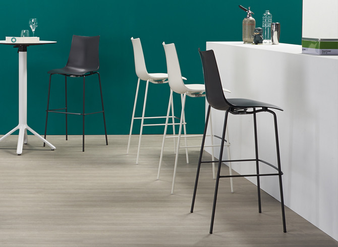 Hocker mit Schale aus recycelbarem Technopolymer. 4-beinige Struktur aus lackiertem Stahlrohr ø 16 mm, in zwei Höhen erhältlich. Für den Innen-/Außenbereich.