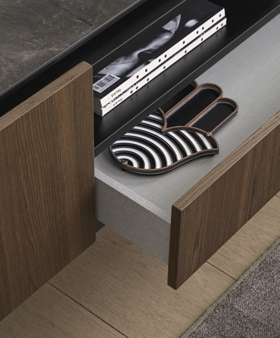 Das Sideboard LAKE CS6076 von Calligaris mit seinen weichen, harmonischen Linien steht vom Boden ab und weist eine ovale Form auf, die durch eine leicht vom Umfang zurückgesetzte Keramikplatte betont wird, wodurch zwischen Tür und Platte ein nützlicher Raum zum Öffnen von Türen und Schubladen entsteht.