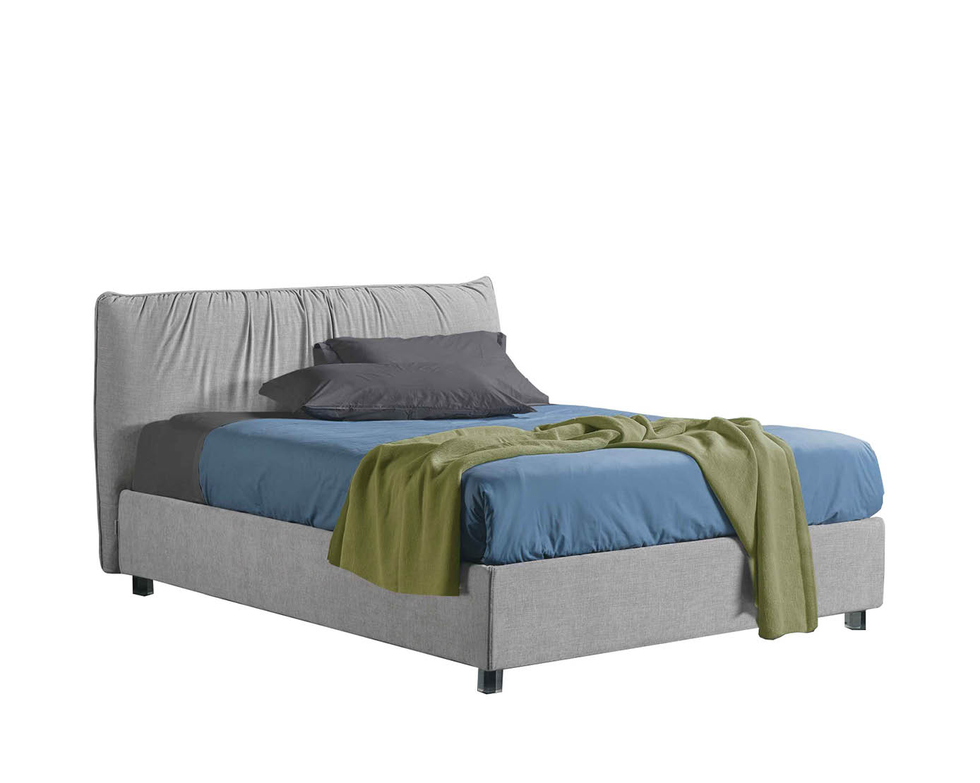 Es kombiniert gekonnt moderne und geradlinige Volumen mit der Eleganz einer raffinierten Drapierung am Kopfteil und macht dieses Bett zu einem Produkt feinster Handwerkskunst.