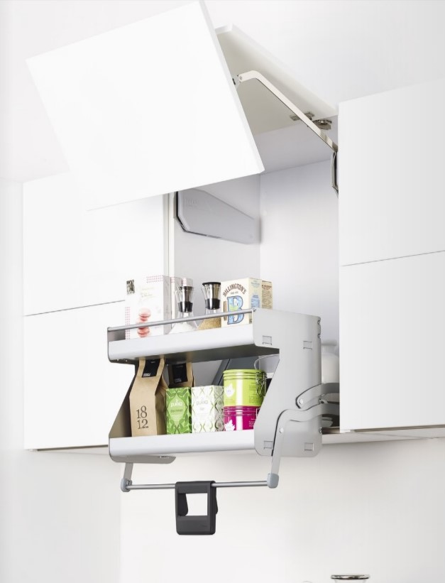 Die Bedienung erfolgt mit nur einer Hand. Mit einer einzigen, eleganten Bewegung bewegt sich der gesamte obere Boden nach unten und vor den Schrank. So erreichen Sie Ihre zu verstauenden Gegenstände noch leichter.