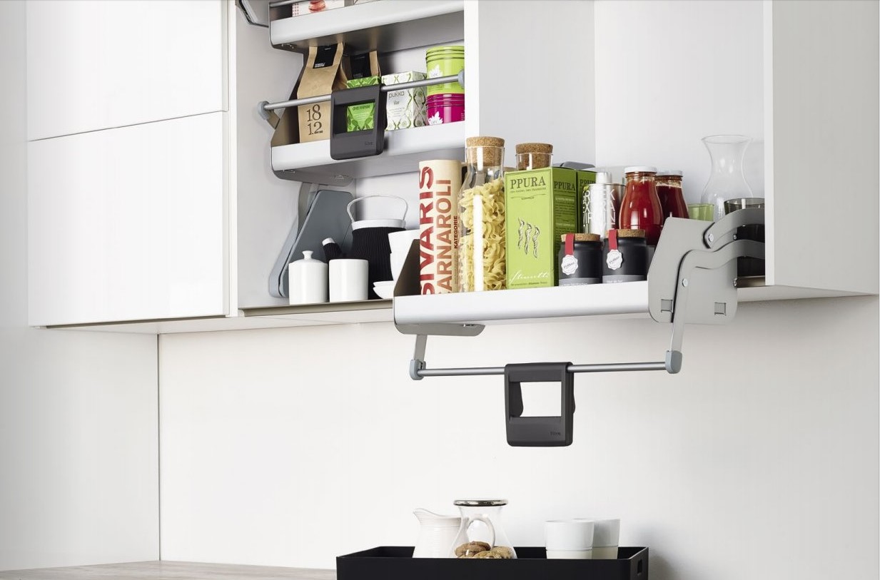 Die Bedienung erfolgt mit nur einer Hand. Mit einer einzigen, eleganten Bewegung bewegt sich der gesamte obere Boden nach unten und vor den Schrank. So erreichen Sie Ihre zu verstauenden Gegenstände noch leichter.
