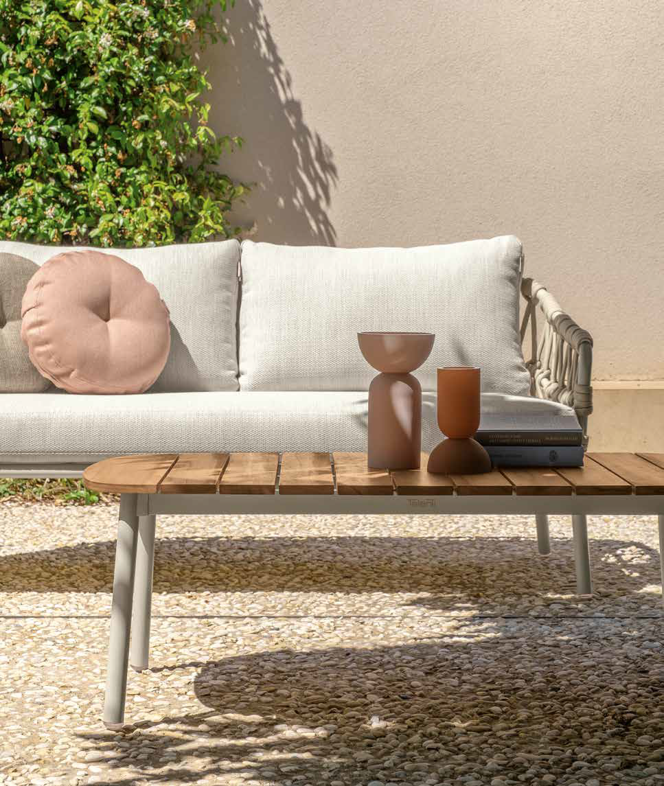 • Sofa Iris: A3 – Warmweißes Aluminium; C2 – Sitz- und Rückenkissenbezug in Schlossweiß; R11 – Schneeweißes Kunstseil