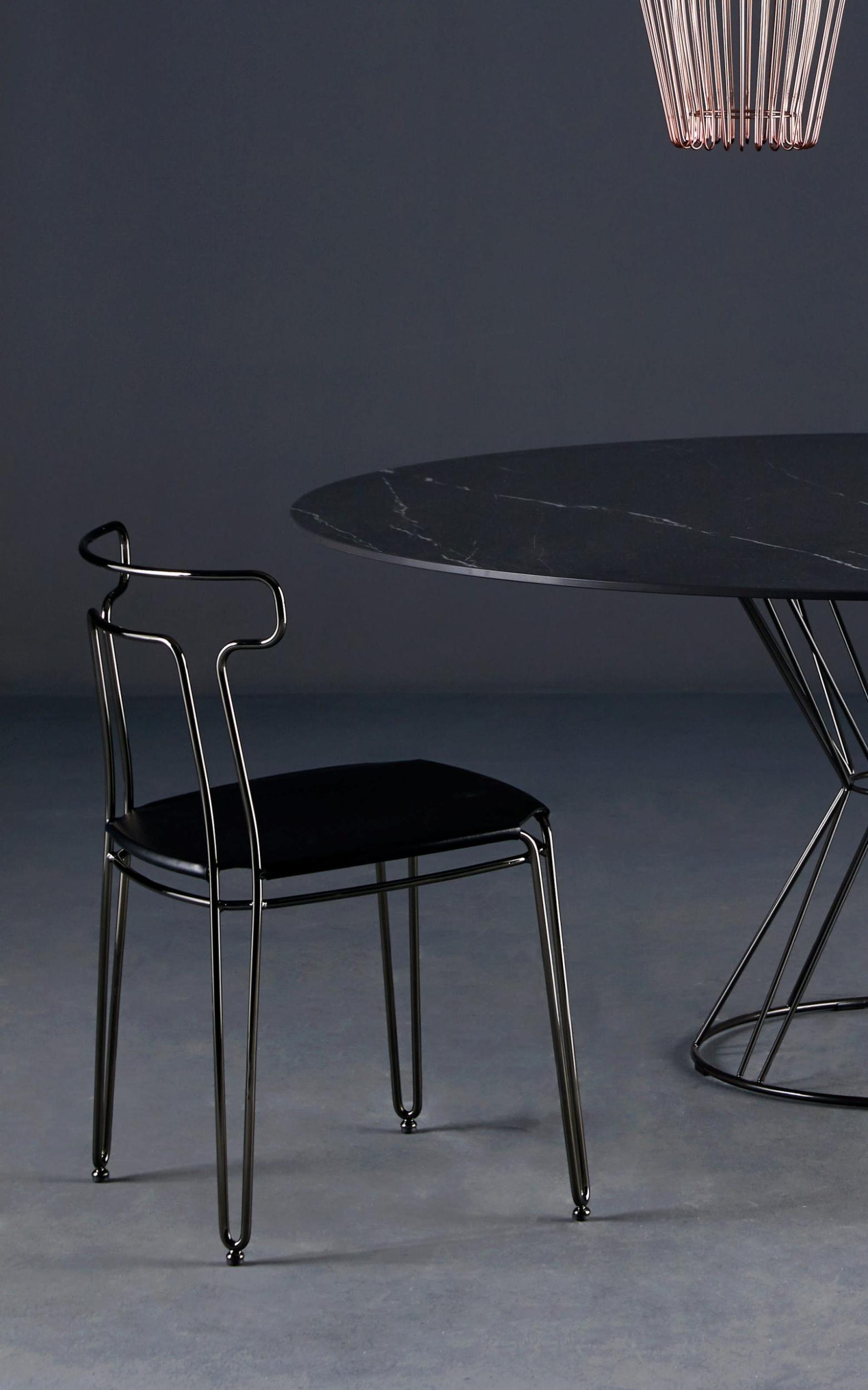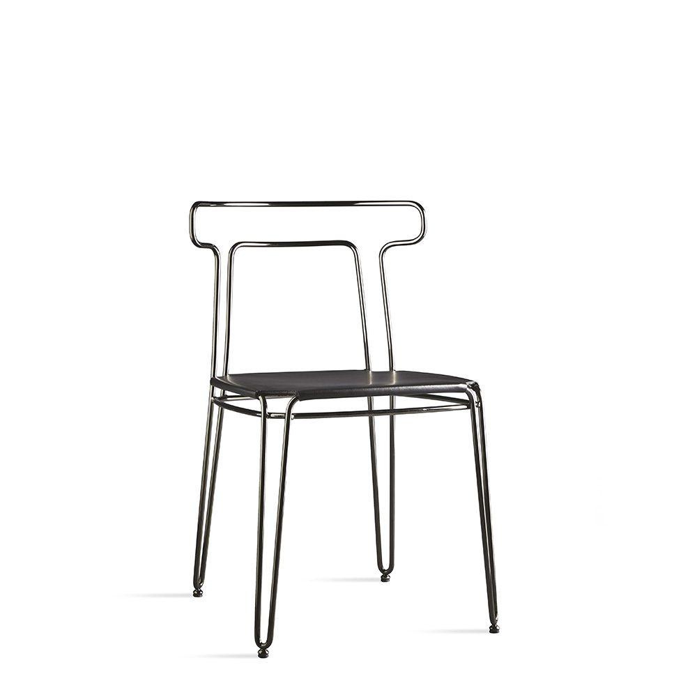Stuhl mit Stahlstangenrahmen und Sitzfläche mit Lederbezug. Warm und überzeugend, die harmonische Linienführung erinnert an Sitzmöbel aus vergangenen Zeiten, das verwendete Material ist kühl. Eine einzigartige Balance, die Jackie zu einem einzigartigen und unnachahmlichen Stuhl macht.