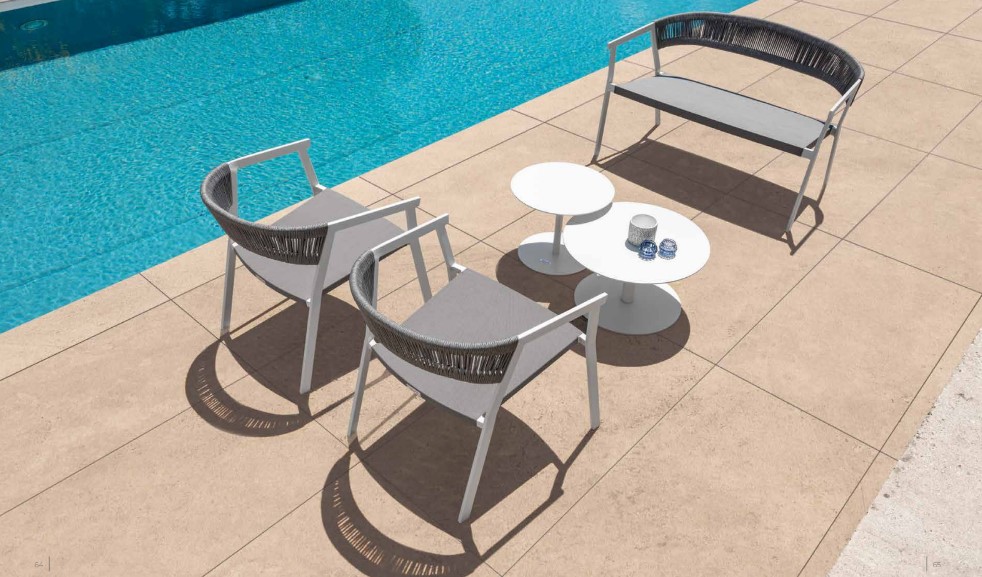 Das Sofa der Key-Kollektion vereint gekonnt leichte Materialien mit eleganten Formen. Das Aluminiumgestell stützt den Körper, während Textilene-Kissen durch das charakteristische synthetische Kordelgeflecht der Kollektion fixiert werden.